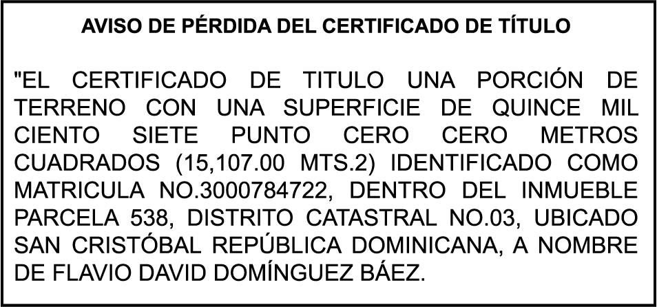 PERDIDA DE PLACA L476023, Vehículo de Carga MITSUBISHI, color BLANCO, año 2023, chasis MMBJJKL10PH060471, a nombre de SYNGENTA CROP PROTECTION S A SE hace de público conocimiento la pérdida de certificado de depósito número 811245273 emitido por Banco Popular Dominicano, S. A., a favor de MARIA VEGA CLAUDIO Cedula de identidad y Electoral número 226-00153583, expedido en fecha 28 de diciembre de 2018 por el monto de (RD$98,156.69), más intereses generados a la fecha.