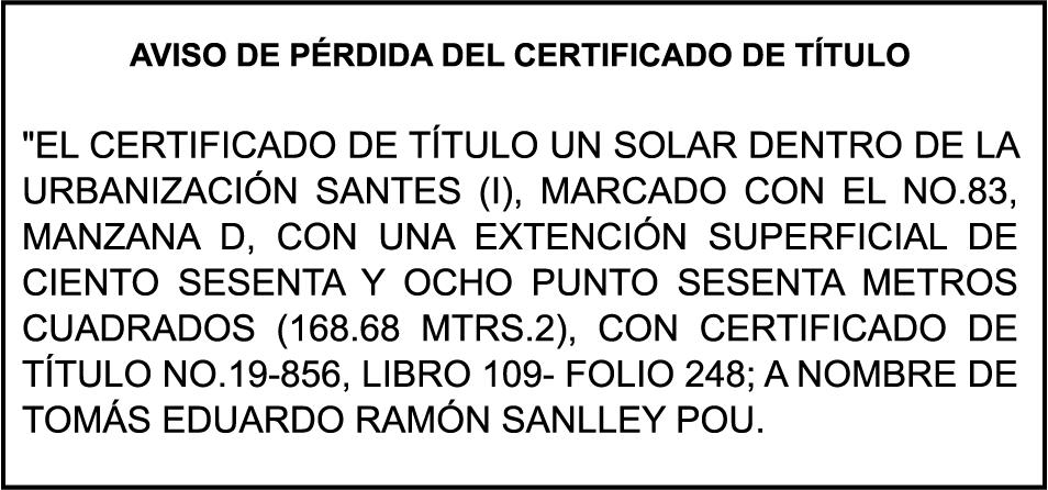 SE hace de público conocimiento la pérdida de certificado de depósito número 795409432 emitido por Banco Popular Dominicano, S. A., a favor de MIRTHA MARIA CARPIO MARIA Cedula de identidad y Electoral número 026-00163550, expedido en fecha 16 de febrero de 2016 por el monto de (RD$37,045.07), más intereses generados a la fecha.