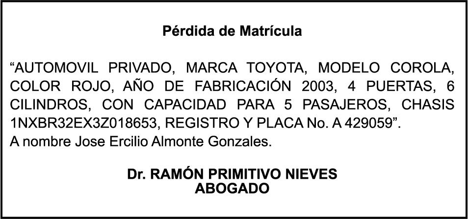 PERDIDA DE MATRICULA DEL VEHICULO DAIHATSU COLOR AZUL AÑO 2001 PLACA L297510 CHASIS V11611604 ANOMBRE DE INGRID DEL CARMEN DURAN FELIX