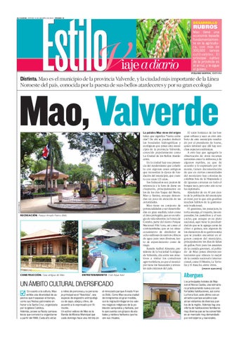 taíno que significa “tierra entre ríos”. De ahí se pueden deducir las bondades hidrográficas y ecológicas que posee este municipio de la provincia Valverde, conocido popularmente como La Ciudad de los Bellos Atardeceres. En la ciudad hay una presencia del modernismo que cohabita con algunas casas antiguas que recuerdan la época de fundación del municipio, que cuenta con unos 125 años. Sus balnearios son puntos de referencia a la hora de darse un chapuzón, principalmente en los de los ríos Yaque del Norte, Mao y Ámina, aunque demandan un poco de atención de las autoridades. Mao tiene un conjunto de potencialidades a ser desarrolladas en gran medida, tales como el área protegida, que es un refugio de vida silvestre; la Furnia de Gurabo, parte del nuevo Parque Nacional Piki Lora, así como el contraembalse, que es un almacenamiento de alrededor de ocho millones de metros cúbicos de agua para usos diversos, tanto de esparcimiento como de riego. Ramón Aníbal Almonte, presidente de la Sociedad Ecológica de Valverde, cita entre sus atractivos a visitar los corredores agro-turísticos, ya que el municipio tiene los bananales y arrozales más extensos del país.