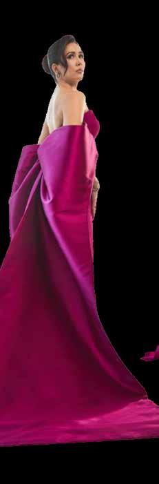 Sobria en el mejor sentido de la palabra, pues la sofisticación es un elemento que esta comunicadora siempre tiene presente en sus elecciones de moda. Sin duda el “Viejo Hollywood” jugó un rol importante dentro de la inspiración, un vestido escotado color magenta adornado para un ligero toque de exageración con una capa asimétrica fuera de hombros. Su total look aspira a no delimitarse en el tiempo al ser totalmente clásico y al