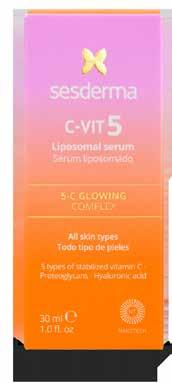 El C-VIT 5 de Sesderma está elaborado con fórmula ultravitaminada, que incluye cinco tipos de vitamina C y sus activos de antienvejecimiento. Entre estos la centella asiática, el ácido hialurónico y los proteoglicanos, junto con el complejo tensor inmediato, para lograr una piel elástica y flexible con efecto al instante.