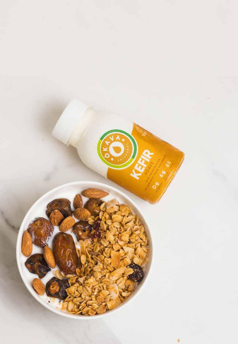 1 taza de kéfir Ókava (cualquier sabor: Natural, Vainilla, Fresa, Blueberry o Agave) 1/2 taza de granola artesanal 1/2 taza de frutas frescas picadas (puedes usar banano, fresa, arándanos, mango, dátiles o kiwi)
