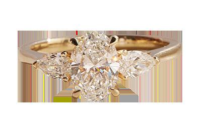 Este estilo presenta una piedra central más grande flanqueada por dos piedras laterales ligeramente más pequeñas, que pueden ser del mismo tipo o combinar gemas distintas. El anillo de tres piedras simboliza el pasado, el presente y el futuro de la relación. La piedra central representa la vida que comparten hoy, mientras que las laterales evocan los recuerdos del pasado y los sueños del futuro.