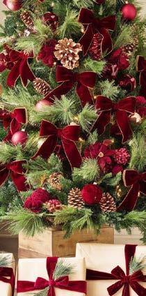 El terciopelo se consagra esta Navidad. Lazos, cintas y bolas velvet en tonos vino, esmeralda, dorado o azul noche crean un árbol sofisticado y lleno de textura. Es la opción perfecta para quienes buscan detalles lujosos y acogedores que transmitan calidez.