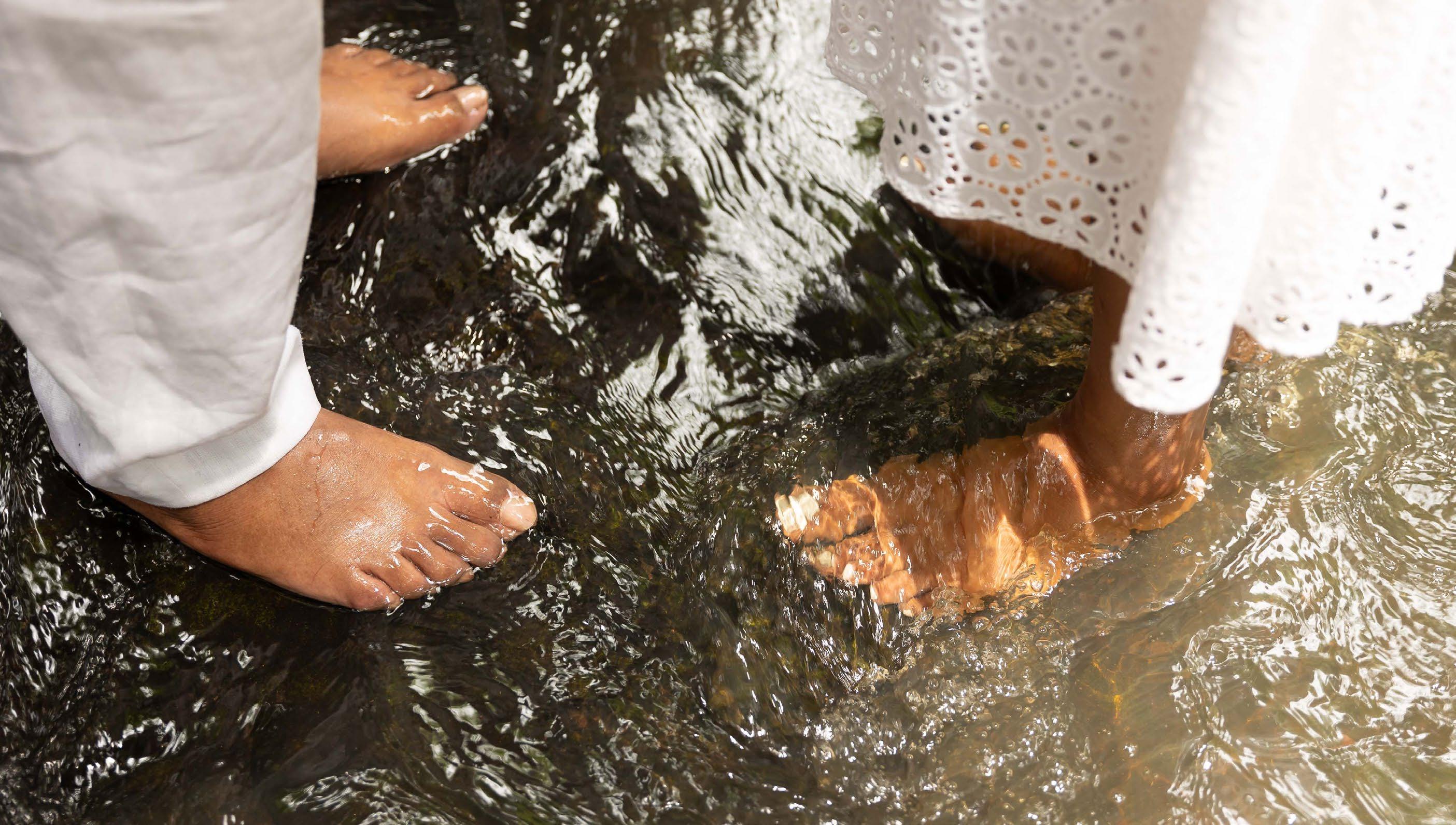 As the group reached the river, after a silent walk down a path shaded by green foliage and people of the nearby village, they were instructed to hold hands with their chosen partner and honor themselves, each other and their ancestors as they stood in the river.