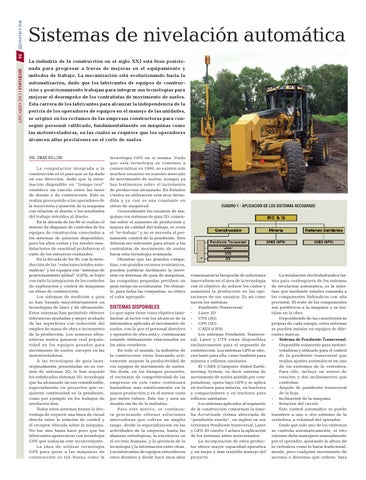 Sistemas de nivelación automática La industria de la construcción en el siglo XXI está bien posicionada para progresar a través de mejoras en el equipamiento y métodos de trabajo. La mecanización está evolucionando hacia la automatización, dado que los fabricantes de equipos de construcción y posicionamiento trabajan para integrar sus tecnologías para mejorar el desempeño de los contratistas de movimiento de suelos. Esta carrera de los fabricantes para alcanzar la independencia de la pericia de los operadores de equipos en el manejo de las unidades, se originó en los reclamos de las empresas constructoras para conseguir personal calificado, fundamentalmente en máquinas como las motoniveladoras, en las cuales se requiere que los operadores alcancen altas precisiones en el corte de suelos.