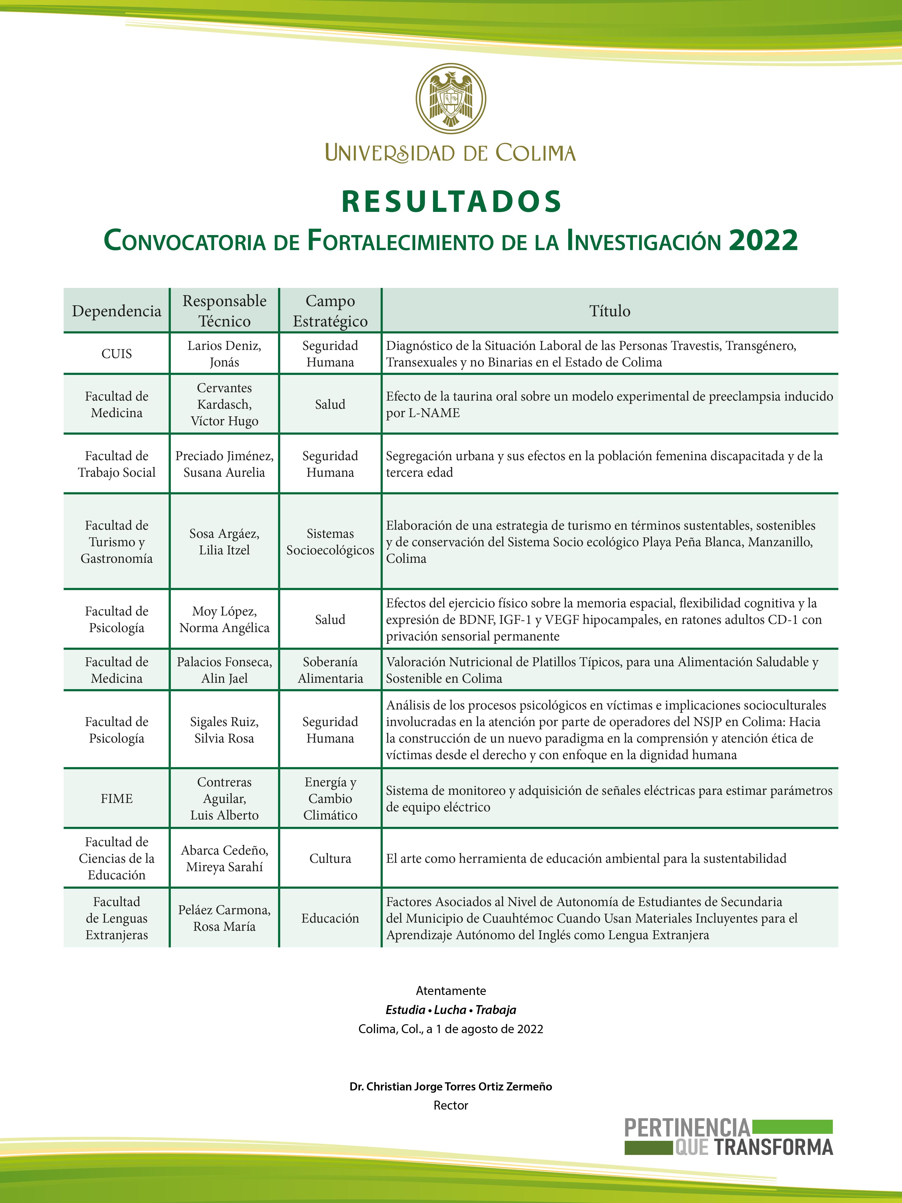Investigación Científica, comentó que “es un gusto para nosotros dar a conocer los resultados de la convocatoria y ver el estímulo que se otorga a la investigación por parte de la Universidad de Colima; éstos son proyectos institucionales que van a incidir directamente en resolver algún problema de la sociedad”. Agregó que incluir a estudiantes en los proyectos “es importante porque se despiertan vocaciones científicas en ellos y ellas y porque el estudiante comienza a participar en la obtención de datos, datos que después se convertirán en un resultado, que bien puede ser una publicación, una intervención a la sociedad o bien un beneficio directo. Es importante que el estudiante sepa valorar el cómo se hace investigación”. Los proyectos apoyados son: “Diagnóstico de la situación laboral de las personas Travestis, Transgénero, Transexuales y no Binarias en el Estado de Colima”, de Jonás Larios Deniz; “Efectos de la taurina oral sobre un modelo experimental de preeclampsia inducido por L-NAME”, de Víctor Hugo Cervantes Kardasch; “Segregación urbana y sus efectos en la población femenina discapacitada y de la tercera
