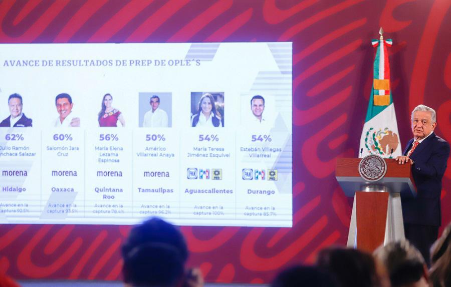 El mandatario exhibió en su rueda de prensa matutina los resultados oficiales del Instituto Nacional Electoral (INE) que muestran que Morena triunfó en Hidalgo, Oaxaca, Quintana Roo y Tamaulipas, mientras que la alianza opositora “Va por México” retuvo Aguascalientes y Durango.