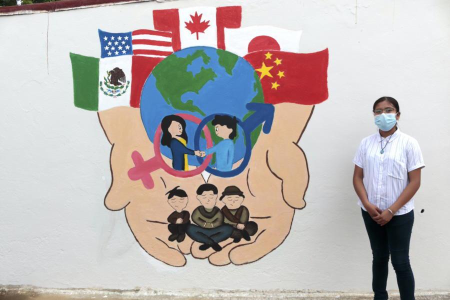 De estos objetivos, María del Carmen destacó en su mural la idea de lograr en el 2030 la igualdad de género, el hambre cero y la inclusión de todas las etnias. Lo pintó a lo largo del semestre y es el primero que realiza, por lo que está emocionada; “es necesario darnos tiempo para mirar el mundo, analizarlo y decidir cómo cambiarlo, ya que el cambio necesita siempre del trabajo de todos”. Su profesor, Ernesto Pérez, dijo que esta obra, además de realzar el esfuerzo de la estudiante, hace que las y los jóvenes valoren las necesidades de la comunidad y del entorno.