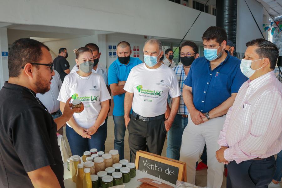 del Rector de la Universidad de Colima, Christian Jorge Torres Ortiz Zermeño, el delegado del campus Villa de Álvarez, Adrián López Virgen, quien señaló que este tianguis busca, “además de apoyar a productores locales, sensibilizar y concientizar a la comunidad universitaria sobre los retos del desarrollo sustentable”.