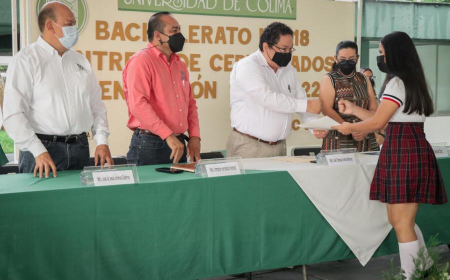 En una ceremonia celebrada este martes (5) en la explanada de la Facultad de Ingeniería Mecánica de la Universidad de Colima, se realizó la entrega de certificados de estudios a las y los 122 alumnos que concluyeron su educación media superior del Bachillerato 18 perteneciente a la Delegación Coquimatlán.