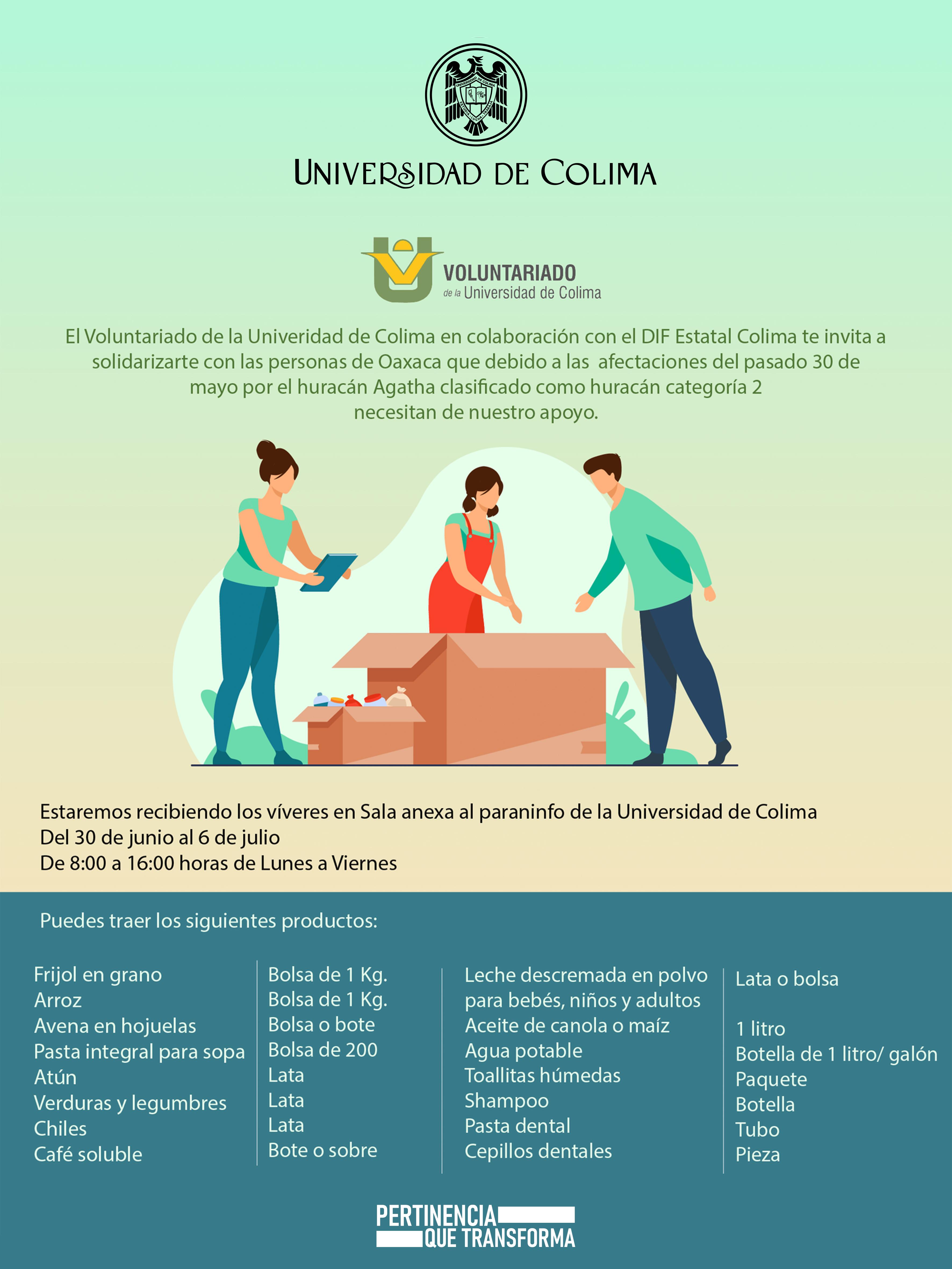 La Universidad de Colima continúa invitando a las y los universitarios para que apoyen con víveres a los habitantes de Oaxaca que resultaron afectados tras el paso de la tormenta Agatha, hace unos días.