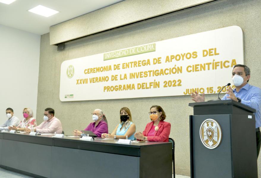ste miércoles (15), el Rector de la Universidad de Colima, doctor Christian Jorge Torres Ortiz Zermeño, entregó becas a 63 estudiantes que asistirán de manera presencial y en algunos casos virtual, al Verano de Investigación Científica del Programa Delfín 2022, en su edición 27, en más de 100 instituciones y centros de investigación del país y de Colombia. La UdeC, a su vez, recibirá a 132 estudiantes que realizarán su estancia de investigación.