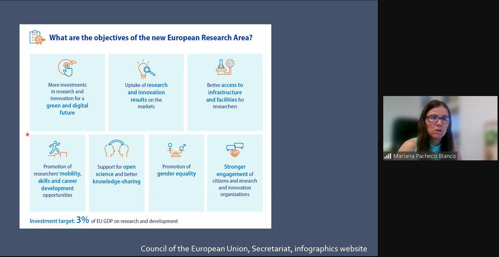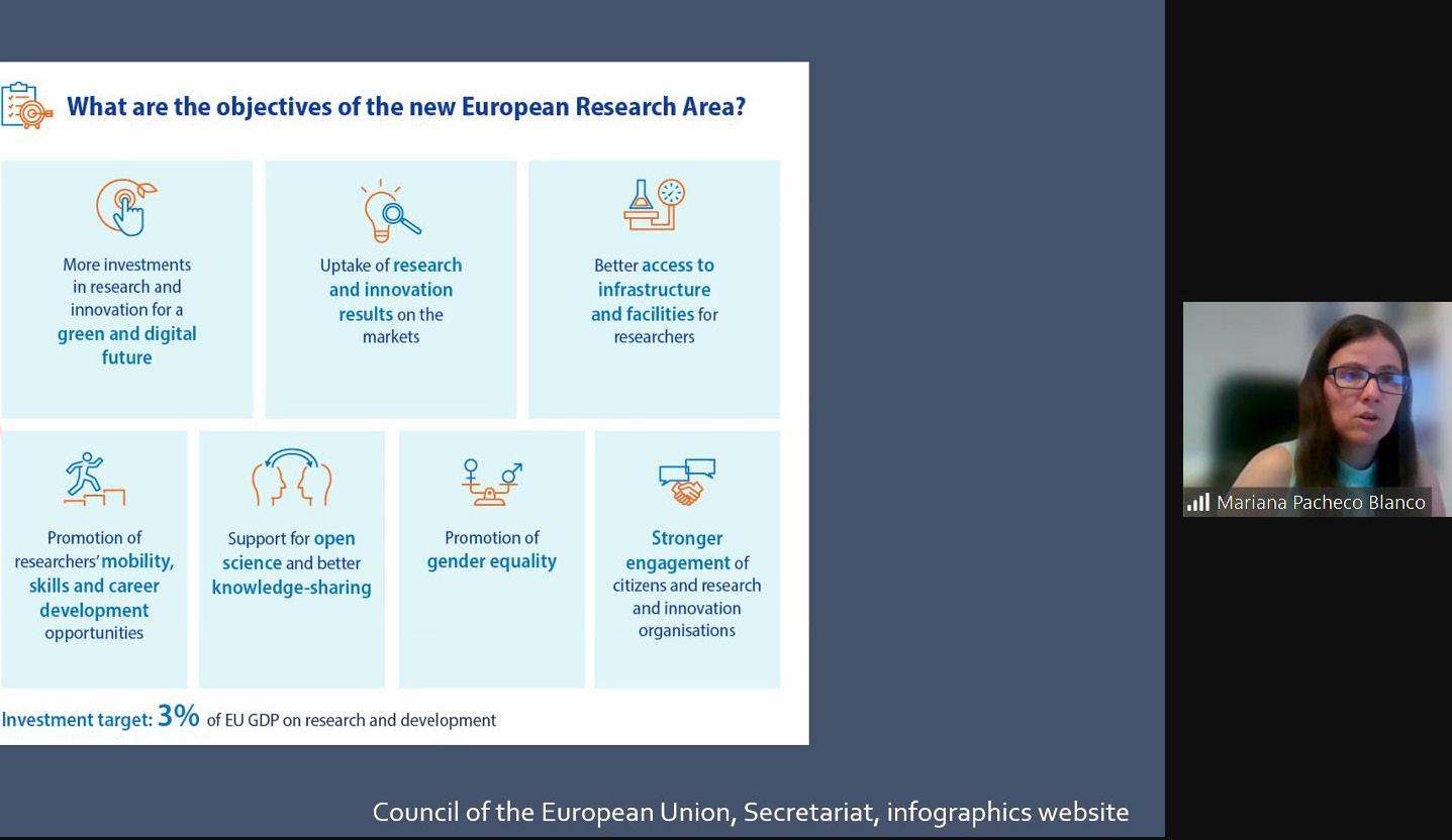 También habló de las innovaciones e investigaciones factibles de ser apoyadas por Europa, como el futuro digital y verde, mercados (economía y trabajo), infraestructura para investigación, movilidad de investigadores, habilidades y desarrollo de carreras, ciencia abierta y mejor intercambio de conocimientos, promoción de la equidad de género, etcétera.