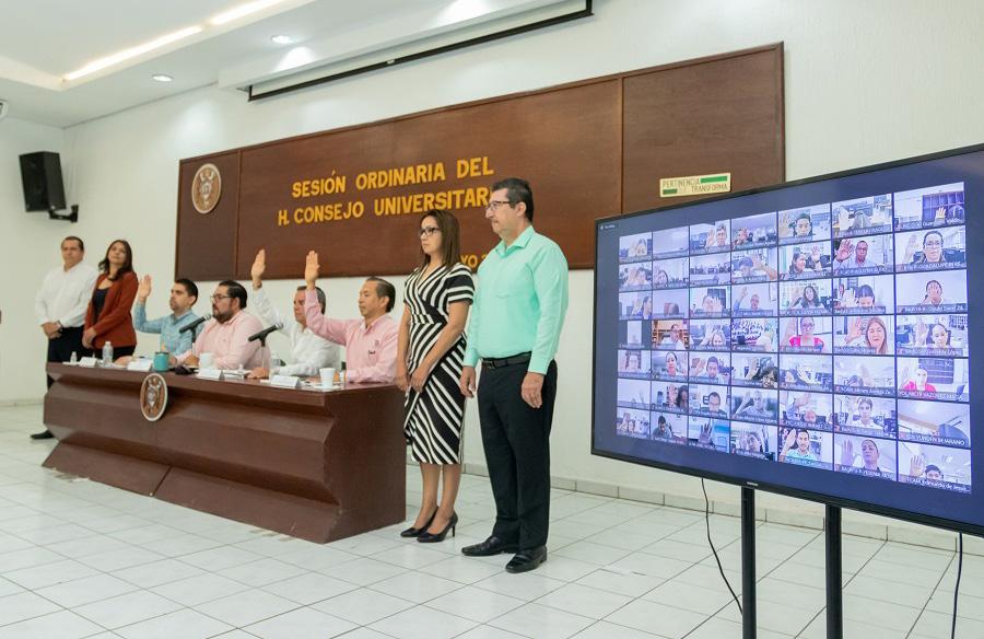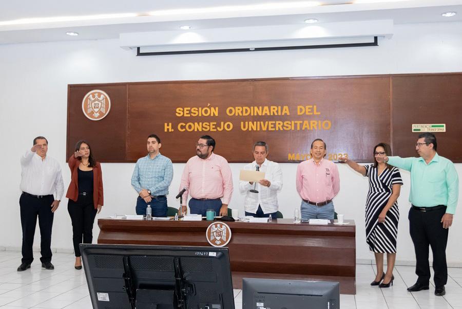 Distinguida a la Maestra Ana Rosa García Mayorga y el nombramiento de Maestro Universitario Distinguido al poeta Ricardo Castillo. Antes de concluir la sesión, el Rector, en su calidad de presidente del Consejo, tomó protesta a las y los nuevos integrantes de las comisiones de Relaciones Laborales y de Hacien-