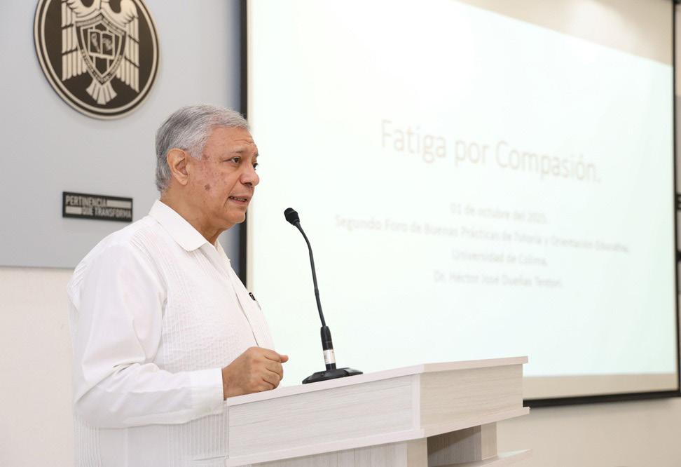 El psiquiatra Héctor José Dueñas Tentori impartió la conferencia “Fatiga por compasión”, en el auditorio de la Facultad de Enfermería de la Universidad de Colima, con la que se inauguraron los trabajos del “Segundo Foro de Buenas Prácticas de la Tutoría y Orientación”, organizado por la Dirección General de Orientación Educativa y Vocacional de esta Casa de Estudios.