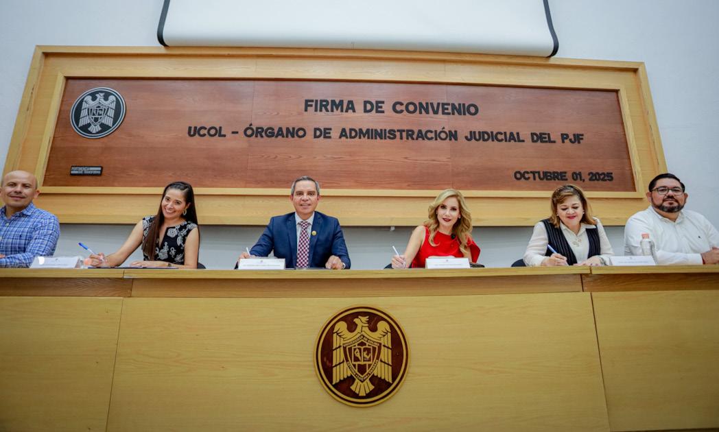 dad de Colima sea la primera institución educativa en el país en firmar un convenio de colaboración con el Poder Judicial de la Federación, a través de la Comisión de Carrera Judicial y Especialización del Órgano de Administración Judicial. “Con ello, reforzamos la posición de la Universidad como el espacio idóneo de