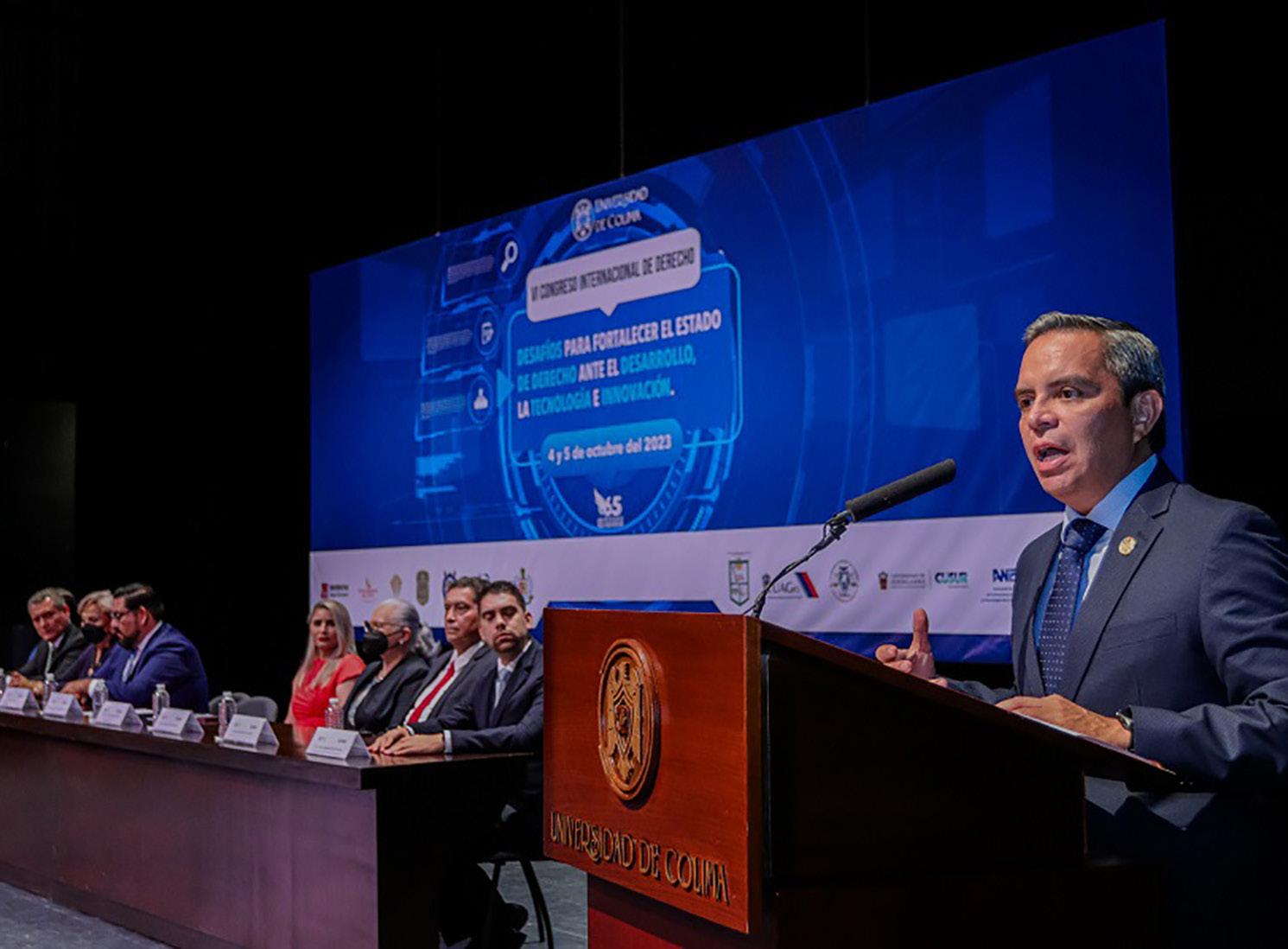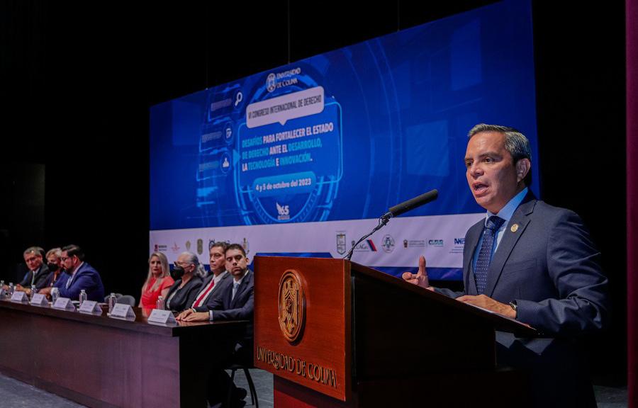 n el Teatro Universitario, Christian Jorge Torres Ortiz Zermeño, Rector de la Universidad de Colima, inauguró el sexto Congreso Internacional de Derecho “Desafíos para fortalecer el Estado de derecho ante el desarrollo, la tecnología e innovación”. El evento, que se realizará el 4 y 5 de octubre, reúne a docentes, investigadores, estudiantes y profesionales en el tema para debatir, analizar y reflexionar sobre el Estado de derecho en el contexto del desarrollo, la tecnología y la innovación.