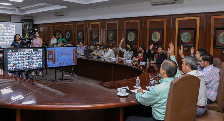 Parte de la sesión se realizó desde los centros de cómputo de los planteles y las oficinas de los campus universitarios y la otra desde la Sala de Juntas de Rectoría. Participaron 361 integrantes del Consejo, un 94.26% del total, y estuvo encabezada por el Rector y presidente de este máximo órgano universitario, Christian Jorge Torres Ortiz Zermeño; Camilo Alejandro García Morales, presidente de la FEC; Luis Enrique Zamorano Manríquez, secretario general del SUTUC; así como por Joel Nino, secretario general de la institución.