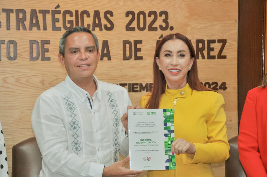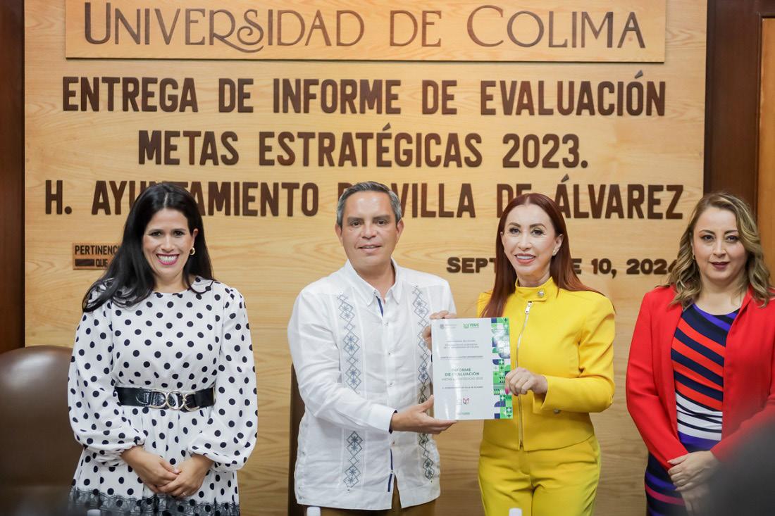 El Rector Christian Jorge Torres Ortiz Zermeño entregó los resultados del Informe de Evaluación de Metas Estratégicas 2023 del Ayuntamiento de Villa de Álvarez, que realizaron académicos y expertos de la Universidad de Colima (UdeC), coordinados por la Federación de Egresados de la Universidad de Colima (FEUC).