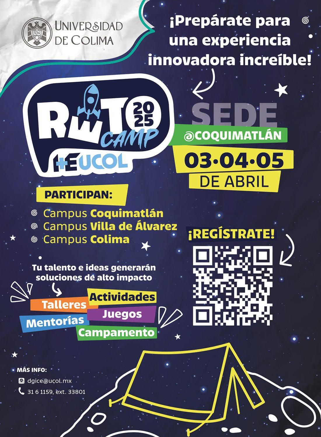 La Universidad de Colima (UdeC), a través de su Dirección General de Innovación y Emprendimiento (DGIE), invita a sumarse a RetoCamp 2025, un innovador espacio de formación y desarrollo que fomenta la colaboración y el networking o trabajo en red entre equipos multidisciplinarios.