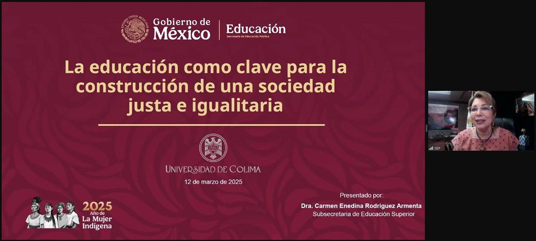 Como parte de las actividades conmemorativas por el Día Internacional de la Mujer, la Universidad de Colima (UdeC) organizó la conferencia magistral “La educación como clave para la construcción de una sociedad justa e igualitaria”, impartida vía Zoom por la doctora Carmen Enedina Rodríguez Armenta, subsecretaria de Educación Superior de la SEP. El evento fue encabezado por el Rector de la UdeC, doctor Christian Jorge Torres Ortiz Zermeño, y organizado por el Centro Universitario para la Igualdad y los Estudios de Género (CUpIEG), el Voluntariado Universitario y la Asociación Colimense de Universitarias (ACU).