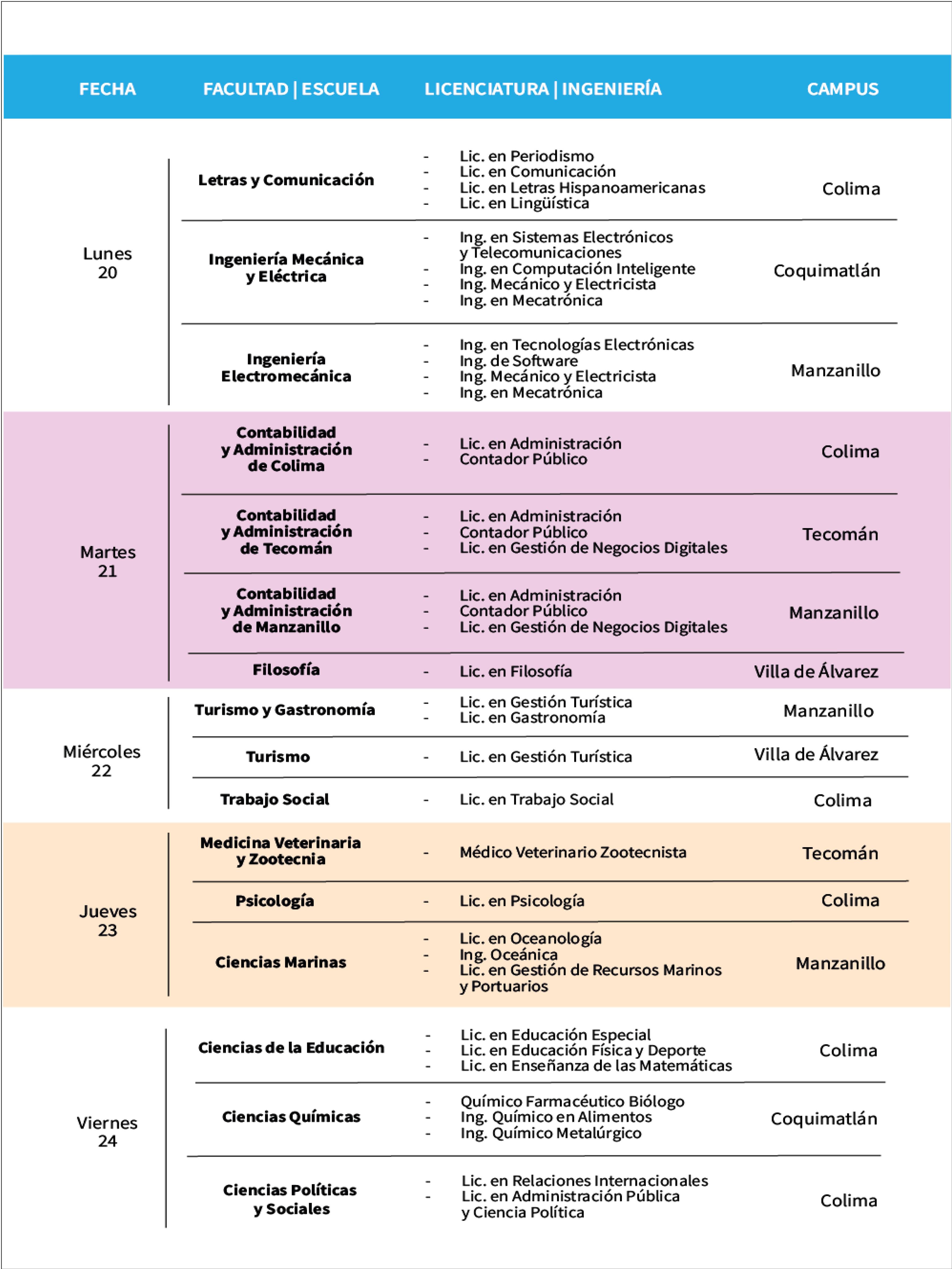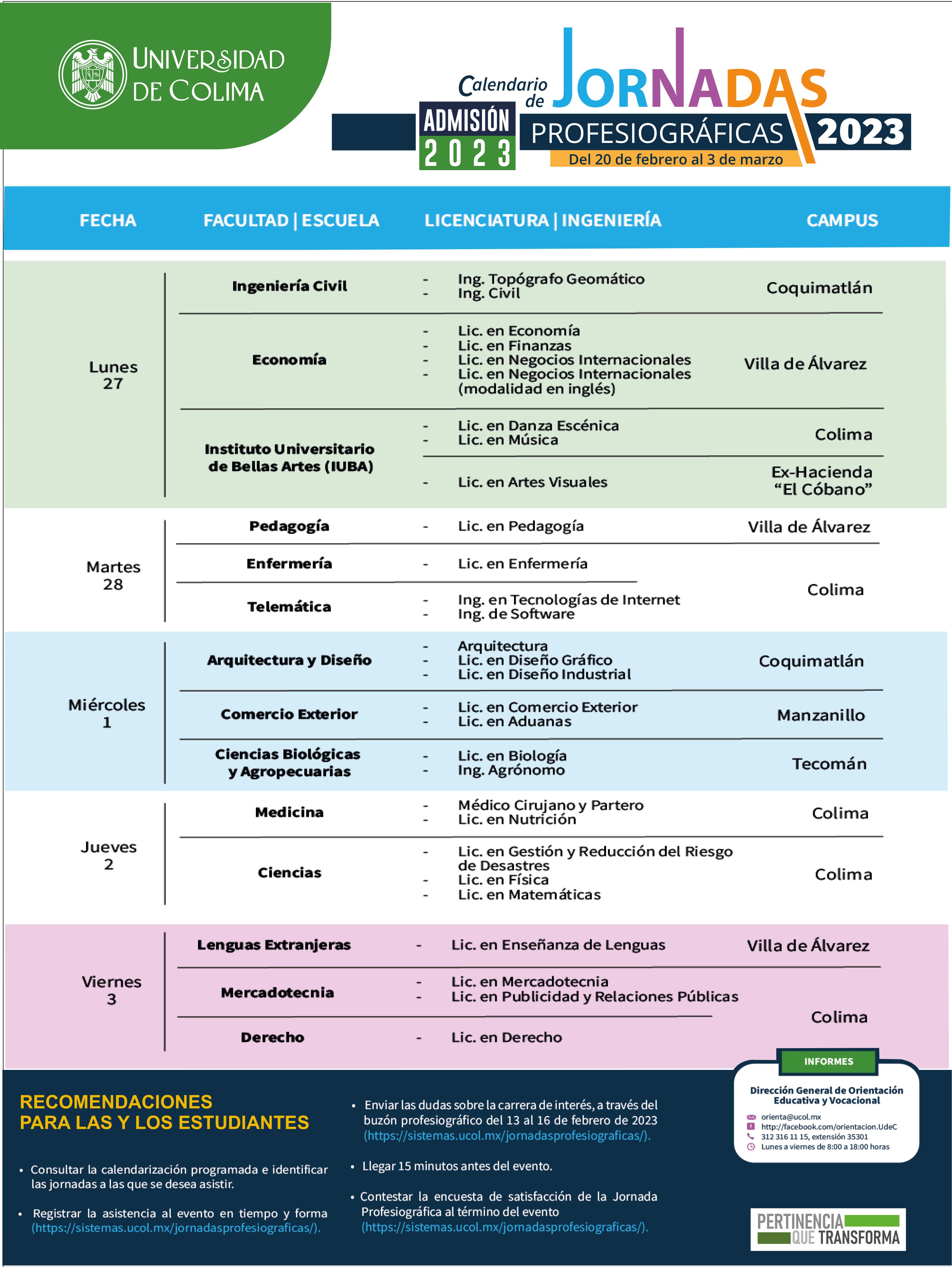 Las Jornadas Profesiográficas tendrán 2 horarios: 9 de la mañana y 4 de la tarde, en los 5 campus que conforman la Universidad de Colima; “la invitación es para la sociedad en general, pero especialmente para estudiantes de los últimos semestres que integran los bachilleratos de nuestra institución”; de igual manera, están abiertas a los colegios y escuelas incorporadas y pueden participar padres y madres de familia así como educadores, “sobre todo invito a las y los orientadores educativos para que los acompañen, los motiven a y que puedan tomar una mejor decisión”.