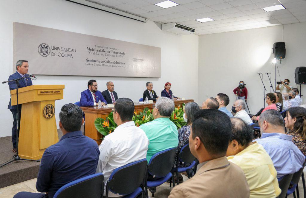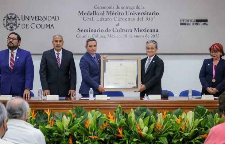 Este miércoles (18), en un acto solemne celebrado en el Archivo Histórico de la Universidad de Colima, el Rector Christian Jorge Torres Ortiz Zermeño, en nombre de la comunidad universitaria, entregó la presea al Mérito Universitario “Gral. Lázaro Cárdenas del Río” al Seminario de Cultura Mexicana, representado por su presidente, Felipe Leal Fernández, “por su papel relevante en la educación nacional y la difusión del conocimiento a través de las artes, las ciencias y las humanidades”.