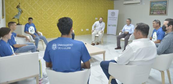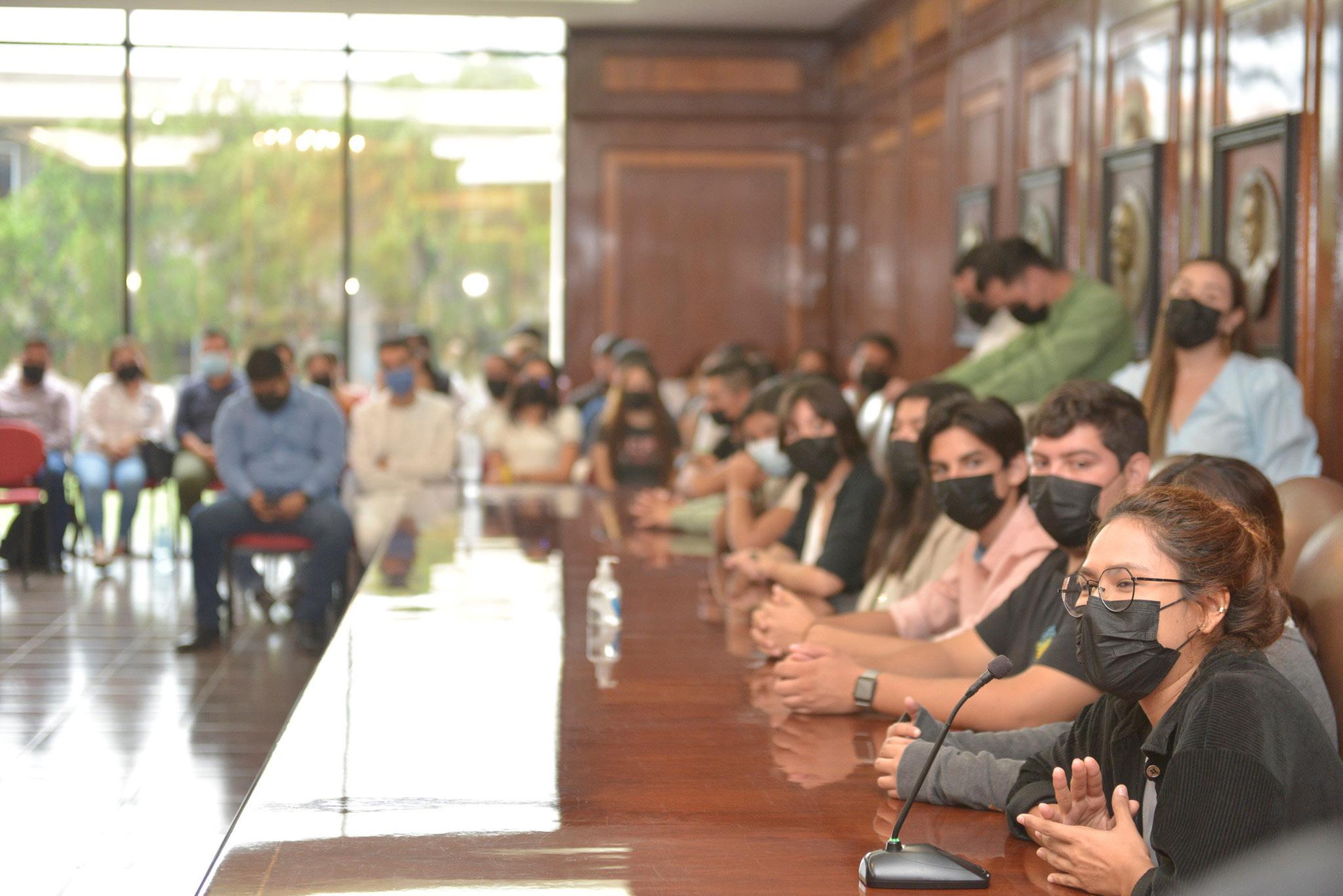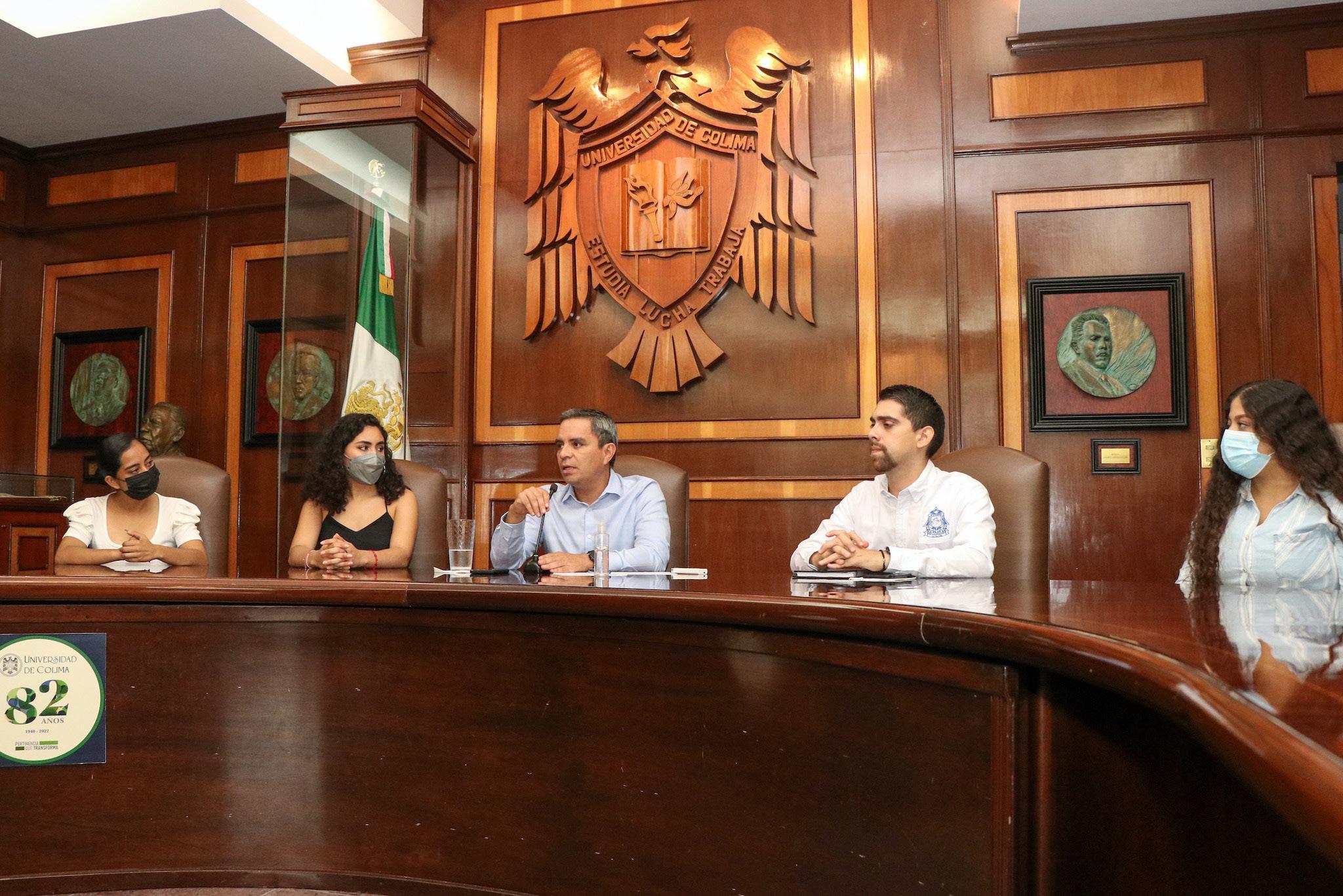 Presidentas y presidentes de las sociedades de alumnos de los 37 bachilleratos y las 30 facultades de la Universidad de Colima, encabezados por Camilo Alejando García Morales, presidente de la Federación de Estudiantes Colimenses (FEC), se reunieron con el Rector Christian Jorge Torres Ortiz Zermeño en la sala