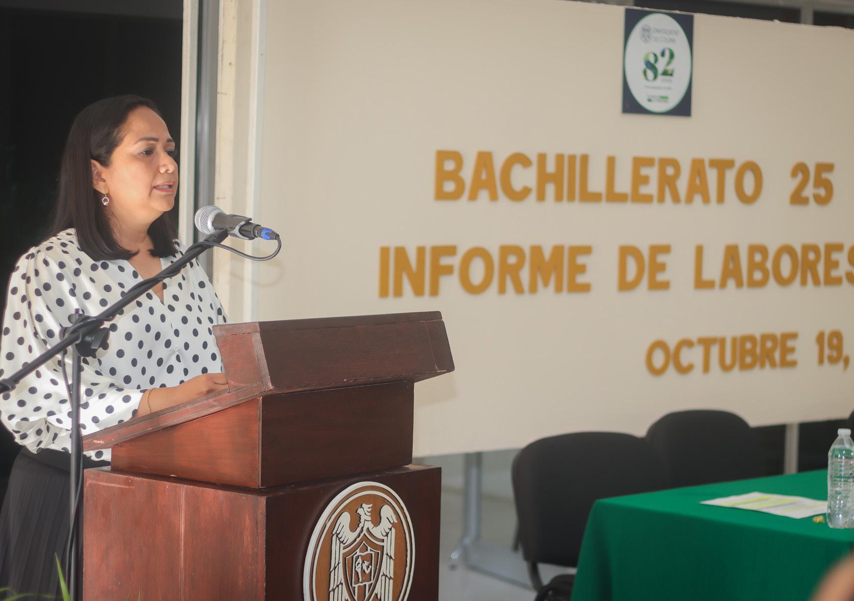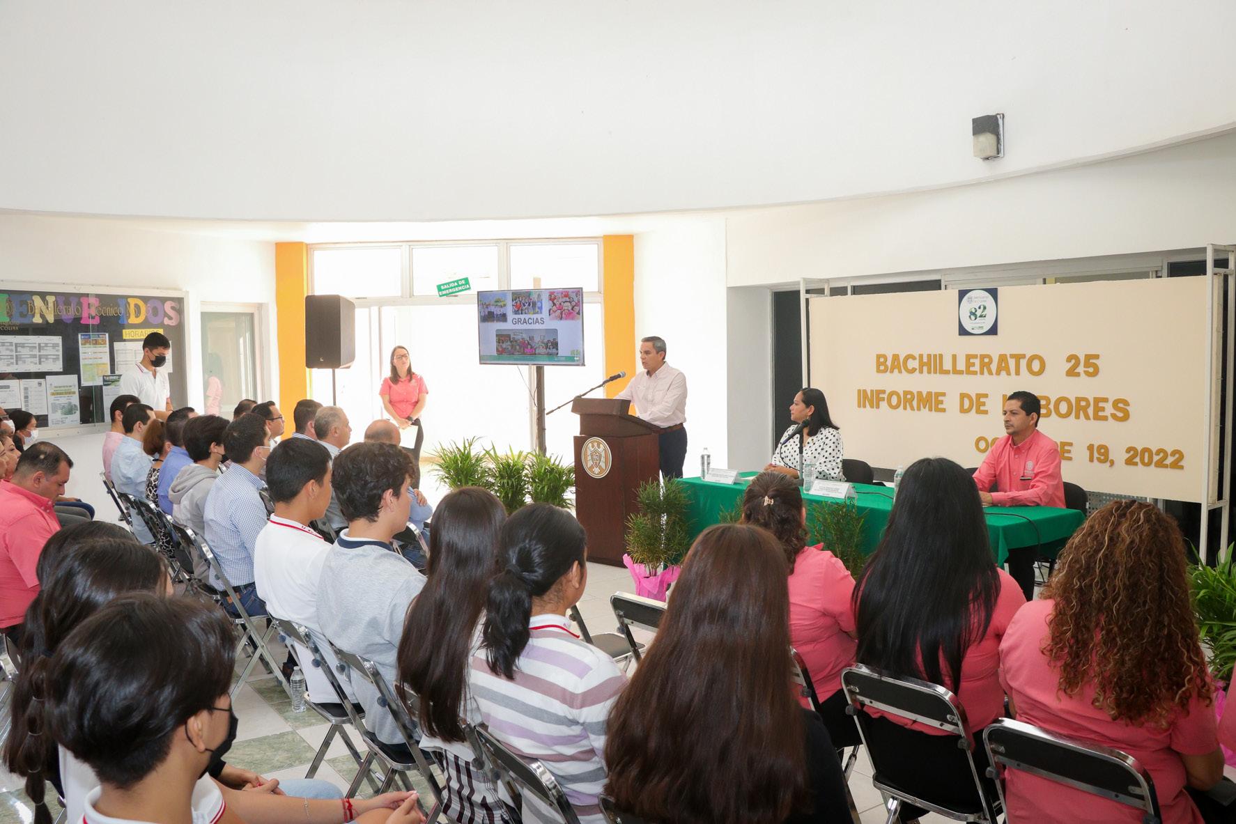 En cuanto a los retos, continuó, “buscaremos proyectar al exterior el trabajo docente y la participación de los estudiantes, elevar el porcentaje de titulación y disminuir la deserción escolar; “estos resultados no serían posibles sin la disposición y compromiso de quienes conformamos la comunidad del Bachillerato 25”. Este acto se realizó en la explanada del edificio central del bachillerato, en Comala.