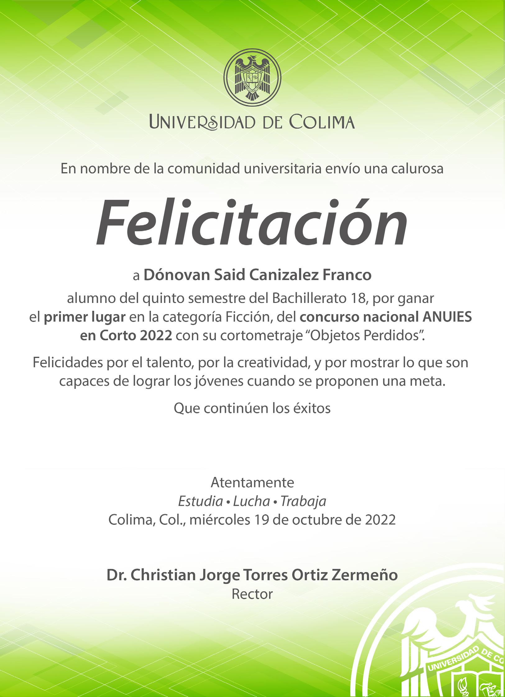 Con el cortometraje “Objetos Perdidos”, Dónovan Said Canizalez Franco, estudiante del Bachillerato 18 de la Universidad de Colima, ubicado en el campus Coquimatlán, ganó el primer lugar en la categoría Ficción, del concurso nacional Anuies en Corto 2022, en el que compitieron jóvenes de bachillerato de la Benemérita Universidad Autónoma de Puebla, de la Universidad Autónoma de la Laguna, la Universidad de Nayarit, Universidad del Valle de Atemajac, la Universidad de Guadalajara y la Universidad de Monterrey.