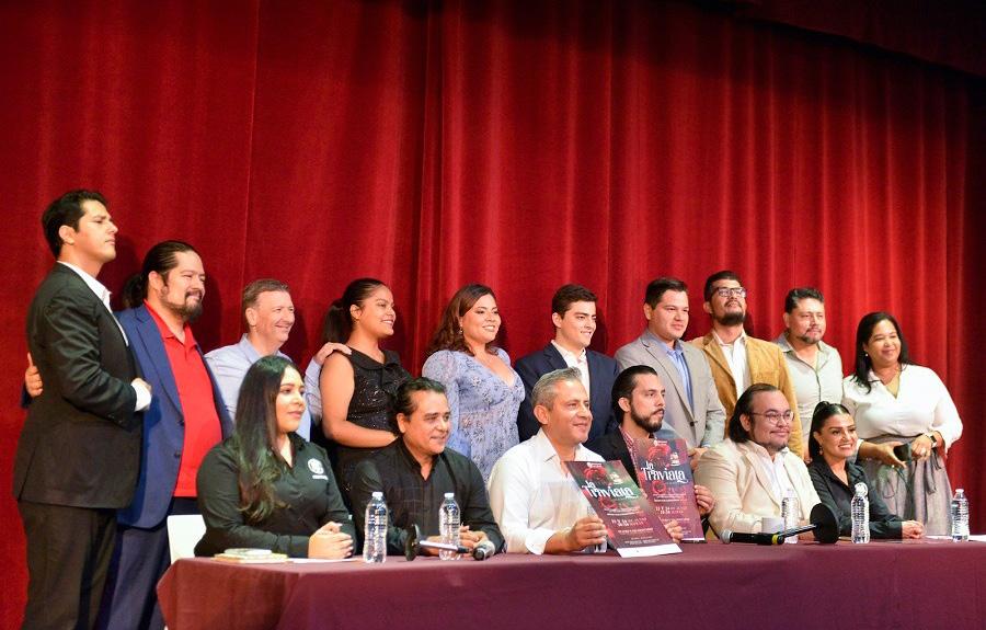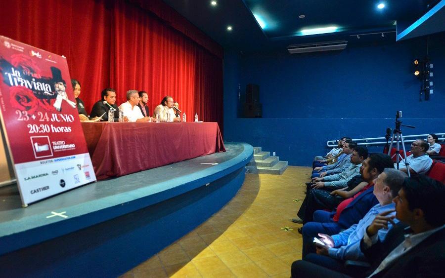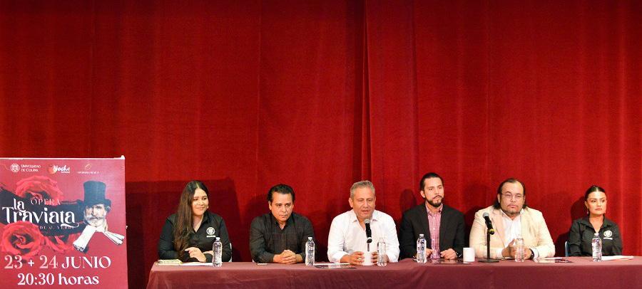 ge Aguilera, director coral; Felipe Castellanos, promotor de ópera de la UdeC; y Amelia Venegas Hernández, coordinadora de recintos de la UdeC. También estuvo presente parte del elenco de la Ópera La Traviata . Manuel Delgado dijo que, pensando en el disfrute y deleite del público asistente, La Traviata se cantará en italiano, el idioma original, y estará subtitulada en tiempo real: “Se tendrá una pantalla donde el público irá leyendo lo que dicen los artistas; queremos dar ese plus de que las personas no tenga la barrera del idioma para disfrutarla. Habrá alrededor de 34 artistas en escena. Es una historia sobre relaciones que nos pasan, que nos han pasado o nos pasarán”.