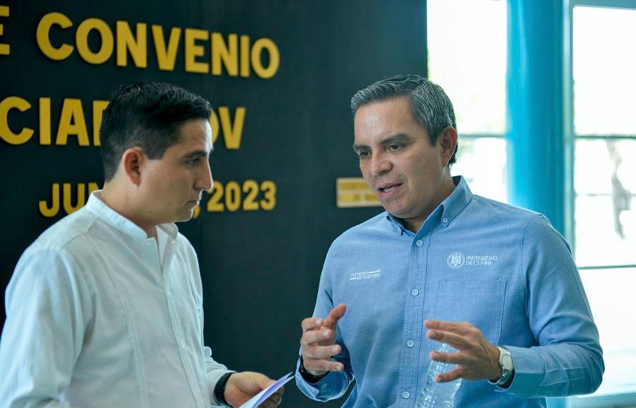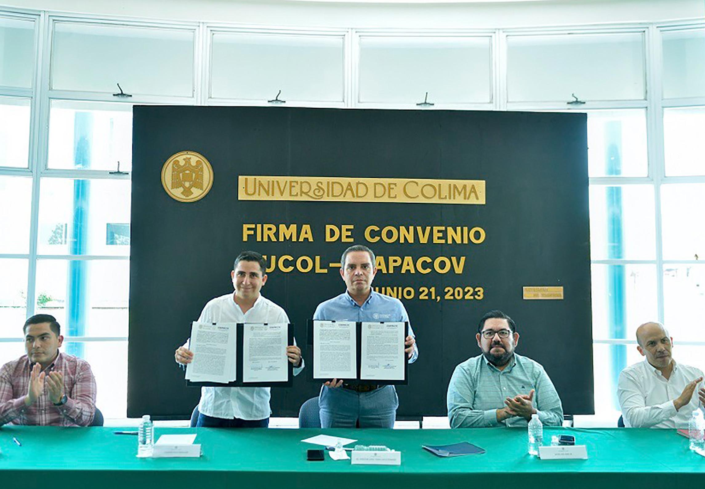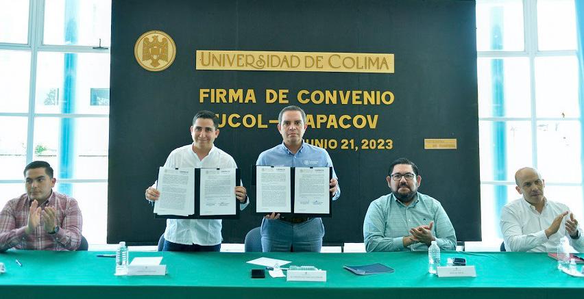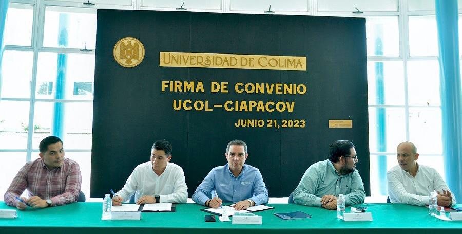 Con el fin de establecer un marco general en el que puedan desarrollarse acciones de educación continua, certificación de competencias, servicio social y práctica profesional, innovación y emprendimiento, vinculación y proyectos relacionados con el cuidado del agua, firmaron un convenio de colaboración la Universidad de Colima y la Comisión Intermunicipal de Agua Potable y Alcantarillado de Colima y Villa de Álvarez (CiapaCov). Por la UdeC firmó su Rector, Christian Jorge Torres Ortiz Zermeño, y por CiapaCov su director general, Vladimir Parra Barragán. El acto se realizó en la biblioteca “Fernando Moreno” de la Facultad de Ciencias Políticas y Sociales, en el Campus Norte.