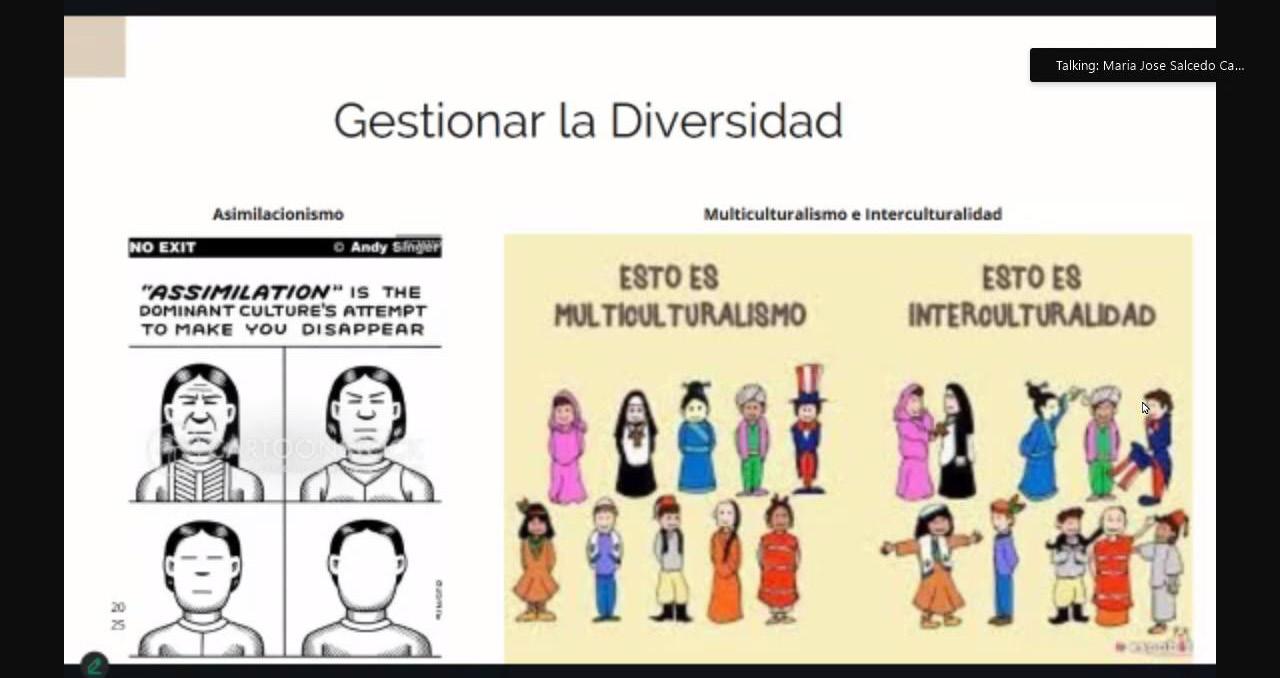 El tercer principio es la interacción positiva. María José aclaró que este tercer punto es lo que diferencia el término interculturalidad del de multiculturalidad. Se refiere a la gestión cotidiana de la diversidad a través de espacios donde diferentes grupos puedan dialogar, conocerse y colaborar, como universidades, escuelas, bibliotecas o instalaciones deportivas.