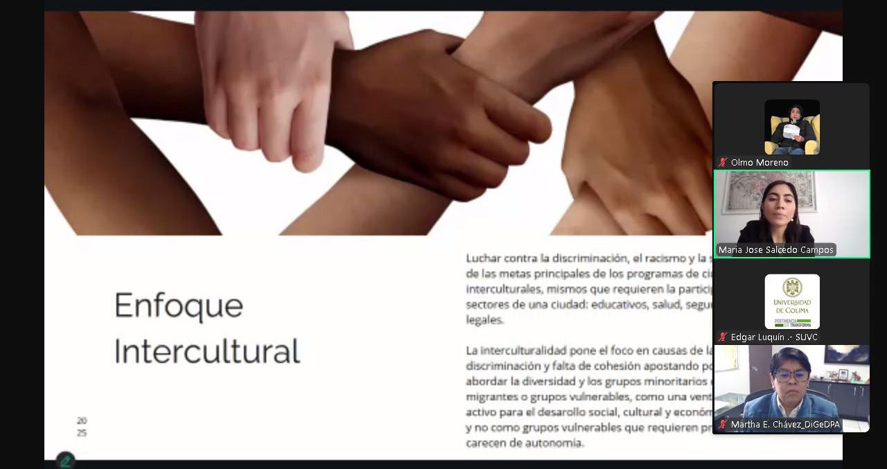 Salcedo Campos subrayó que esta perspectiva aborda la diversidad y la presencia de grupos minoritarios no como obstáculos, sino como ventajas comparativas para el desarrollo social, cultural y económico. “El enfoque intercultural trabaja sobre la falta de cohesión social, integrando activamente a personas migrantes, refugiadas, desplazadas, integrantes de la comunidad LGBT, mujeres, personas con discapacidad y comunidades indígenas”, puntualizó.