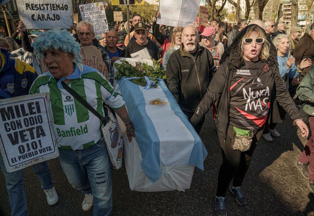 nes sociales, incluyó una demostración en la que jubilados sostuvieron y transportaron en plena calle un ataúd con una bandera argentina encima que simulaba el “entierro” de las pensiones, en referencia a la ne -