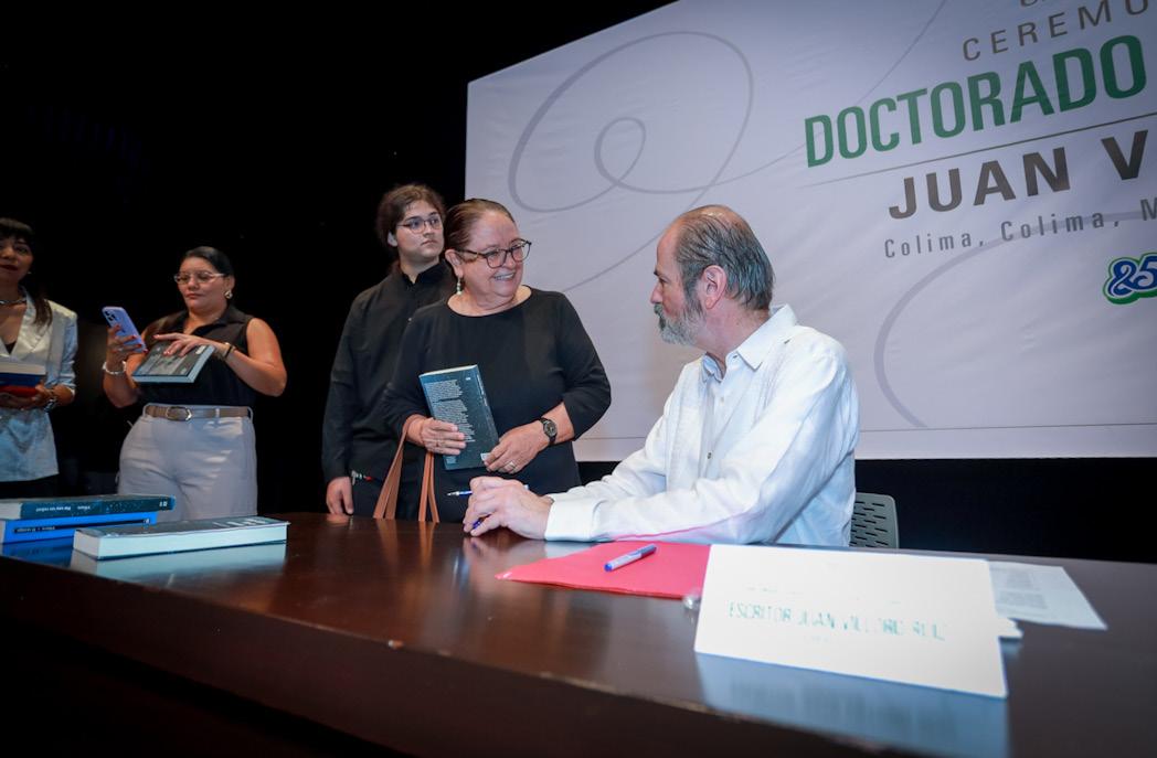 Hoy, la Universidad de Colima ha tenido la generosidad de reconocer mi travesía. Recibo este inmerecido Honoris Causa no como una constatación de un logro, sino como un estímulo para hacerlo valedero. Los tiempos se prestan para el descontento, pero la literatura es el espacio rebelde que demuestra, contra todo pronóstico, que tenemos derecho a la belleza, la pasión y la alegría” finalizó.