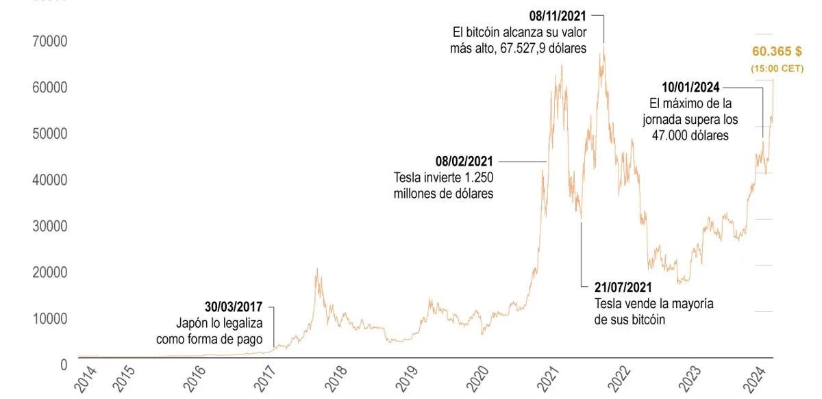 La cotización del bitcoin, la criptomoneda más utilizada, se ha disparado este miércoles al situarse en niveles de noviembre de 2021 y superar los 61,500 dólares esta tarde, tras sobrepasar la víspera los 57,100 dólares.