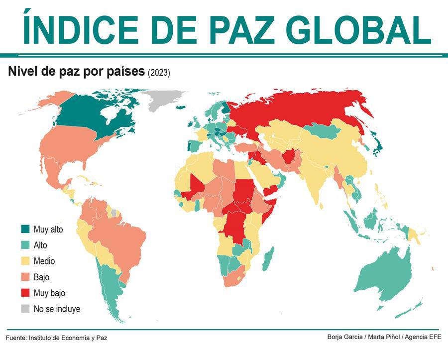 Los países más “pacíficos”, muestra el informe, son Islandia, Dinamarca, Irlanda y Nueva Ze -