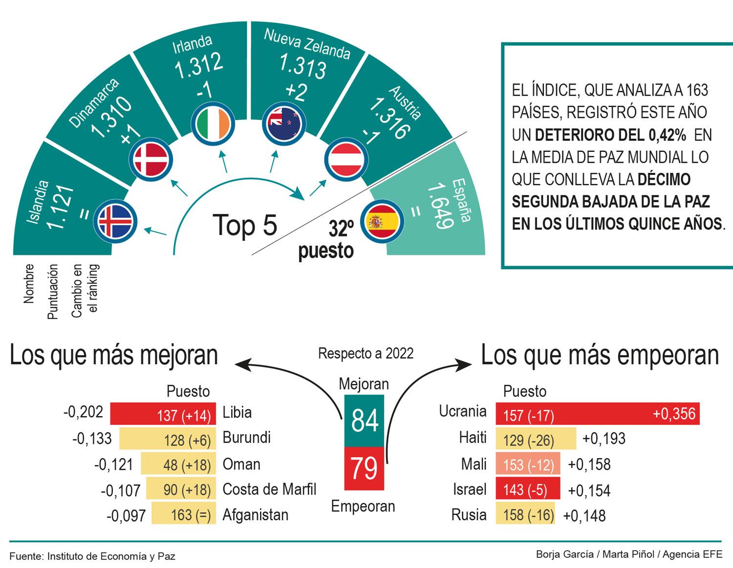 landa, mientras que España ocupa el número 32. Por sexto año consecutivo, Afganistán es el país menos pacífico, seguido de Yemen, Siria, Sudán del Sur y la República Democrática del Congo.
