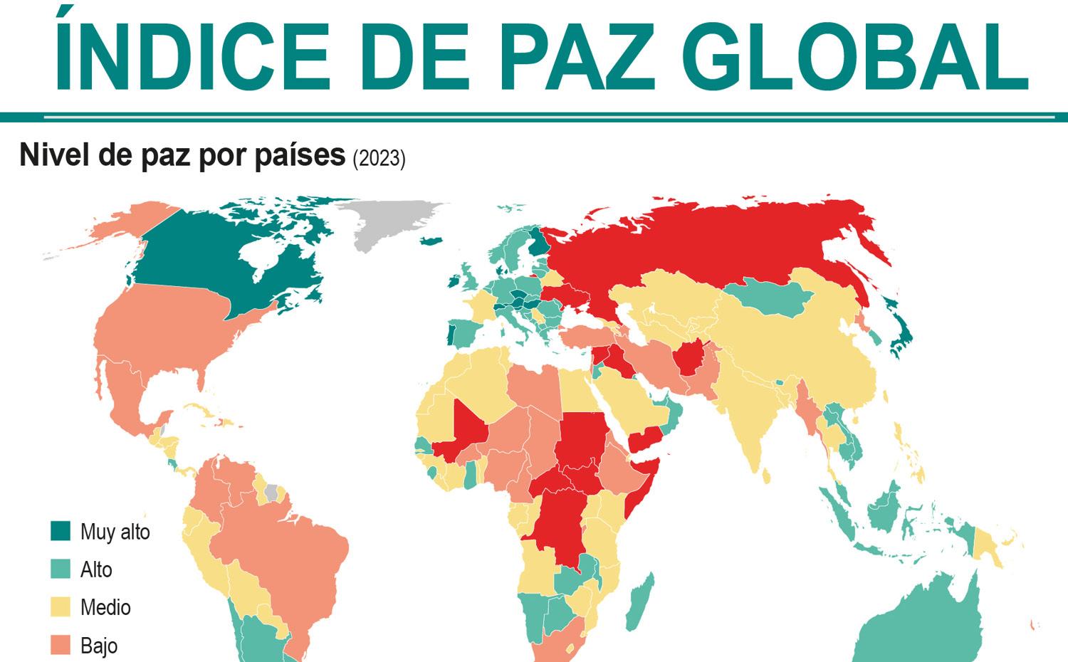de la “inestabilidad política” y “la omnipresencia del crimen organizado”, la situación en los países de América del Sur mejora paulatinamente respecto a años anteriores. En términos económicos, el impacto global de esta escalada de violencia generalizada ha aumentado un 17% respecto al año anterior, con un costo de 17.5 billones de dólares en 2022, lo que equivale a un 12.9% del PIB global. En particular, el impacto económico de la violencia en Ucrania ha aumentado un 479% o 449 mil millones de dólares, el equivalente al 64% del PIB del país. Además, 92 países han aumentado su gasto militar desde 2008: los mayores incrementos provinieron de China, EUA y la India. El informe señala que la internacionalización de los conflictos, causada por intervención de terceros países (como es el caso de Siria, Ucrania y Libia, entre otros), aumentó “considerablemente” en 2022, con un total de 91 países involucrados en conflictos externos en comparación con los 58 países partícipes en 2008. El estudio recalca que las tensiones geopolíticas entre EUA y China, el intervencionismo militar generalizado, el bajo coste de producción y el fácil acceso a cierta tecnología militar (el uso de drones aumentó en un 40.8% en 2022) augura unos años venideros abocados al conflicto.