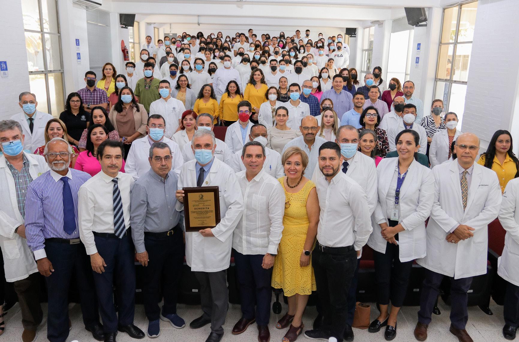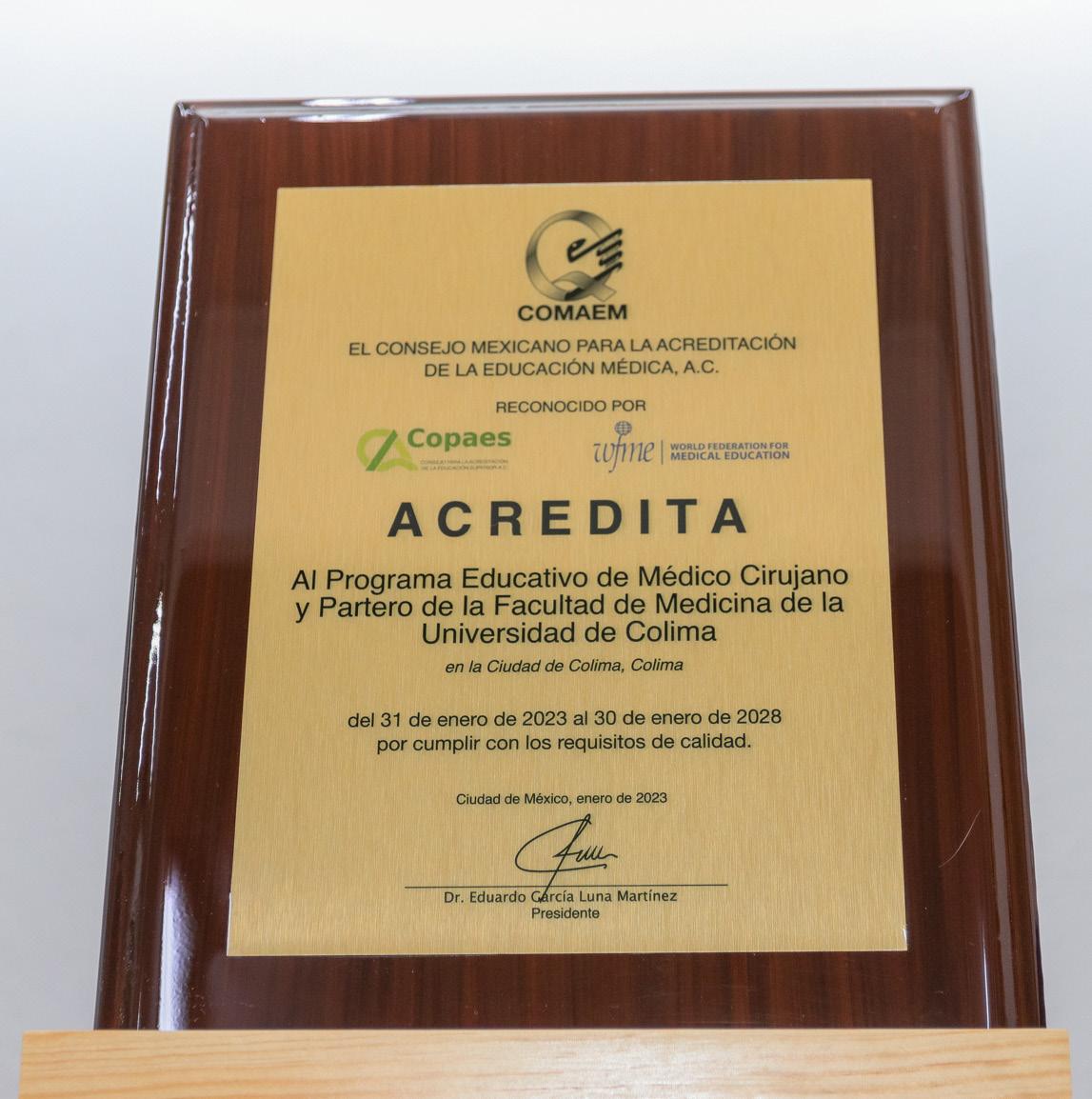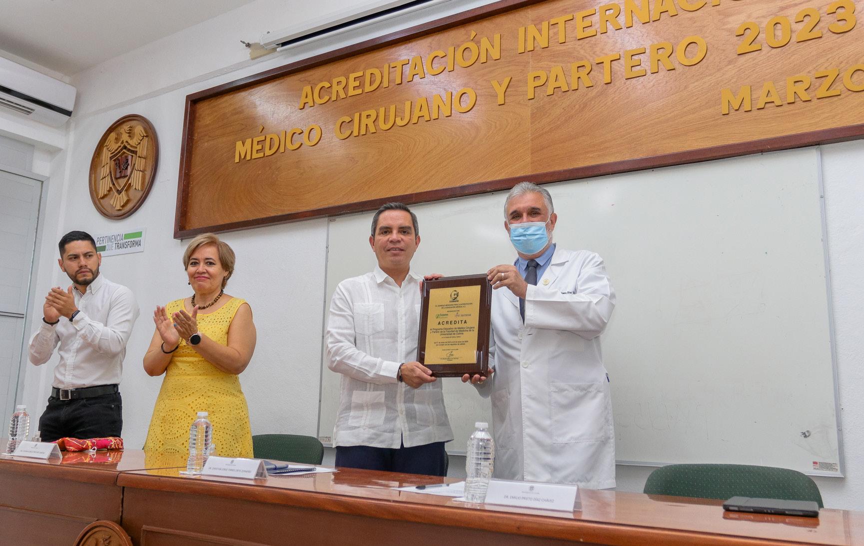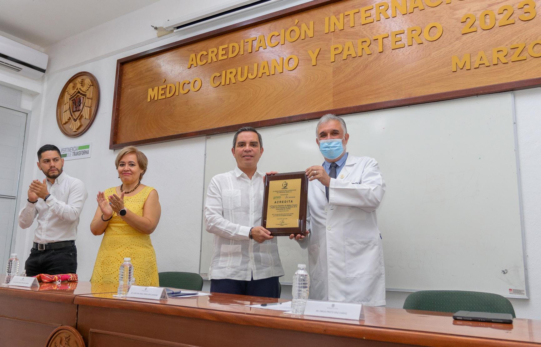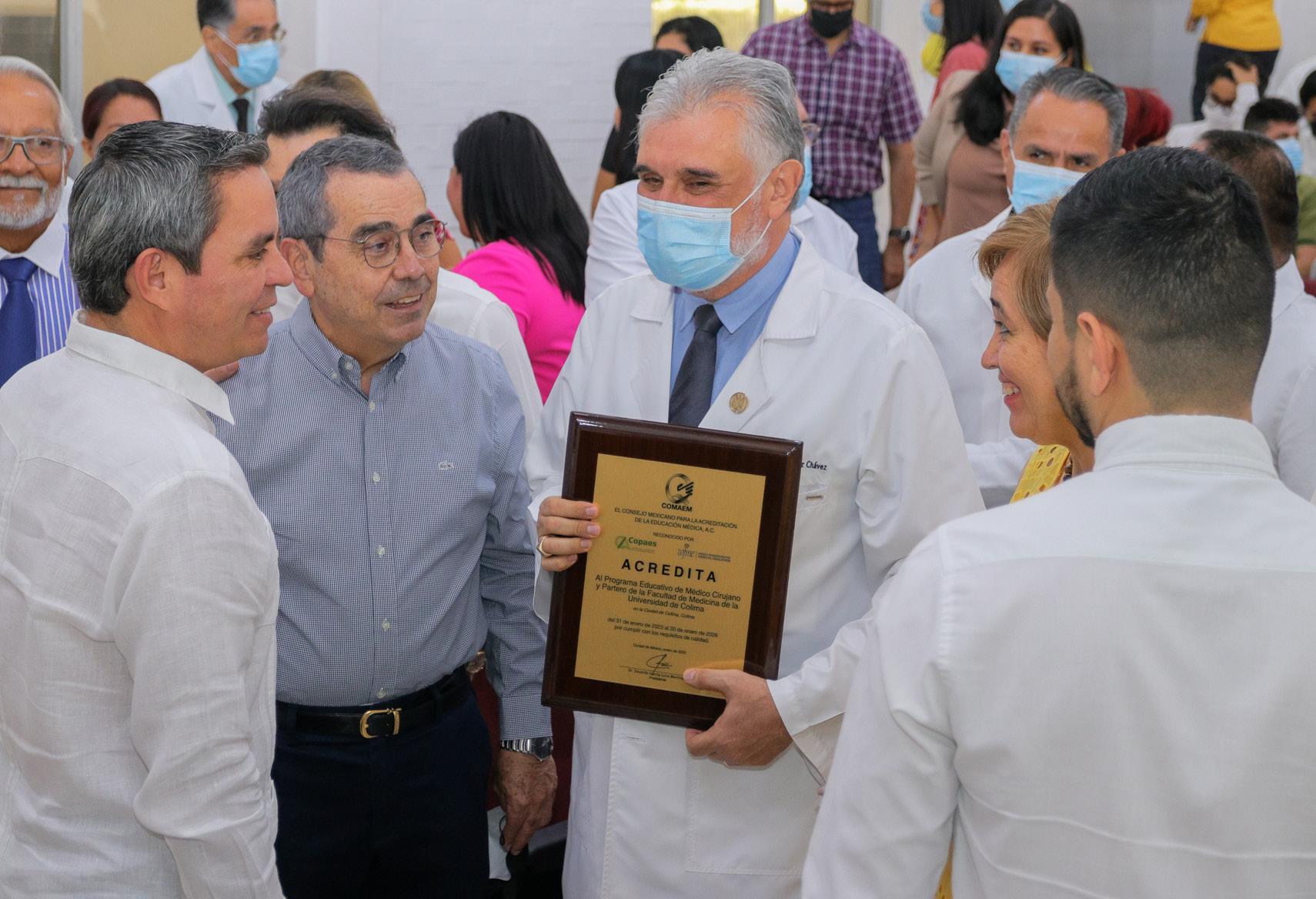 Ante estudiantes, docentes, directores de planteles, invitados especiales y exdirectores, se realizó en el auditorio de la Facultad de Medicina de la Universidad de Colima, la ceremonia de entrega de una placa distintiva que avala la Acreditación Internacional del programa académico de Médico Cirujano y Partero 2023-2028, reconocimiento otorgado por el Consejo Mexicano para la Acreditación de la Educación Médica, A.C. (COMAEM).