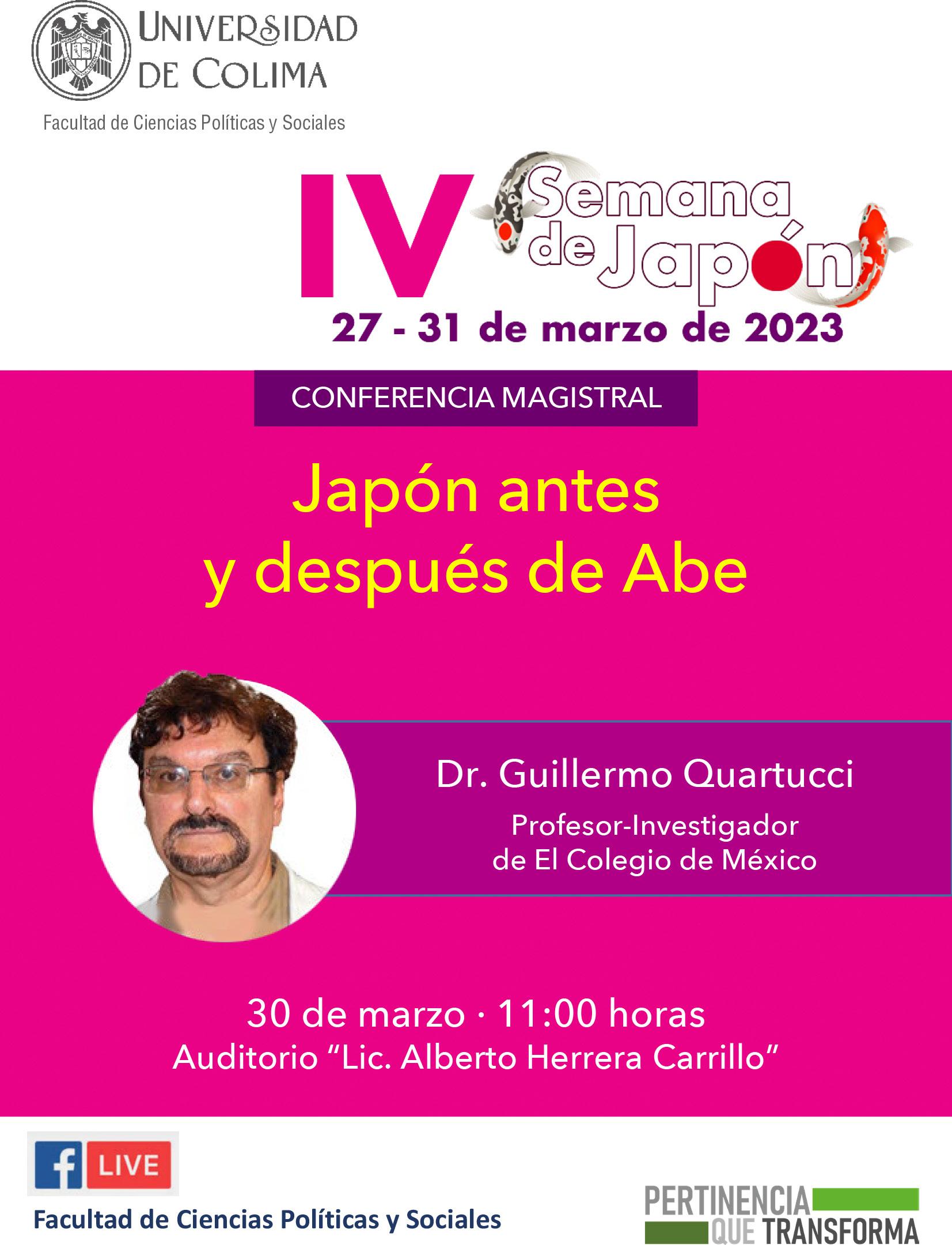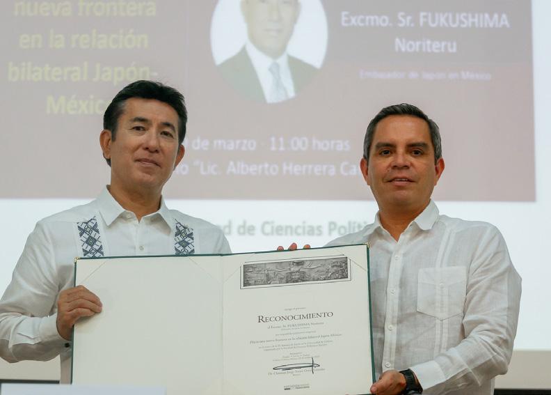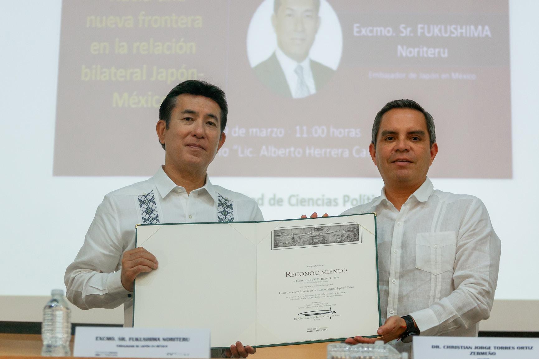 En el marco de la IV Semana de Japón que organiza la Facultad de Ciencias Políticas y Sociales de la Universidad de Colima, se realizaron 2 eventos con la Embajada de Japón en nuestro país; el primero fue un reconocimiento a 2 académicas que han destacado por su interés académico en Japón: la doctora Elena Romero Ortiz y la maestra Martha Loaiza Becerra; el segundo fue la conferencia del embajador de ese país, Fukushima Noriteru: “Hacia una nueva frontera en la relación bilateral Japón-México”.