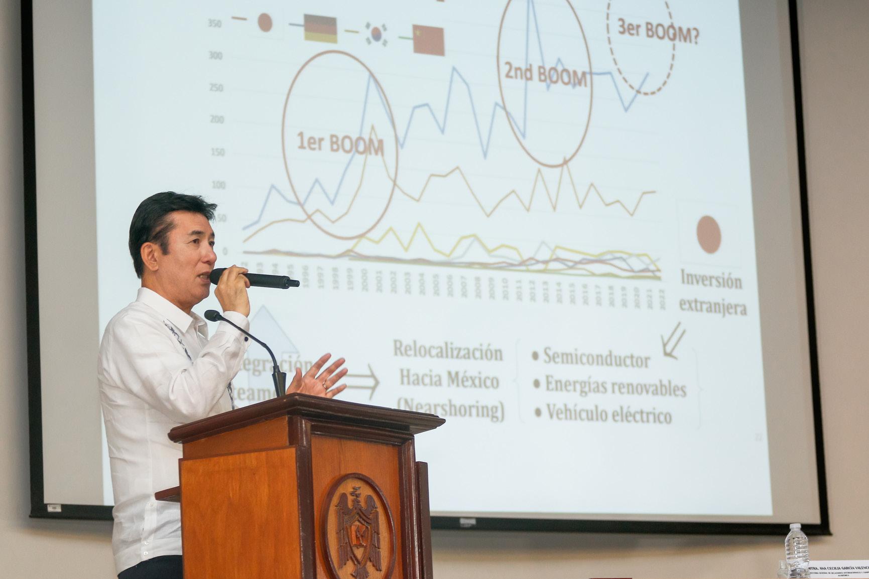 En su conferencia, Fukushima Noriteru resaltó el pasado, presente y futuro de la relación entre ambos países. En este sentido, comentó que nuestras naciones tienen más de 400 años de intercambio económico: “En 1613, Japón y México, con el fin de establecer relaciones comerciales directas, tuvieron su primer acercamiento; sin embargo, fue hasta 1888 que estos países firmaron un tratado igualitario que abrió la frontera a Japón con otros países del continente americano”.