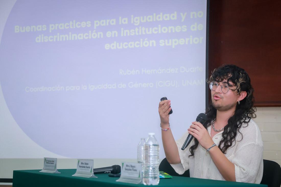 Le maestre Rubén Hernández Duarte, titular de la Dirección de Políticas de Igualdad y No Discriminación de la Coordinación para la Igualdad de Género en la UNAM, impartió la conferencia “Buenas prácticas para la igualdad y no discriminación en instituciones de educación superior”, en el Auditorio “Gregorio Macedo” de la Facultad de Letras y Comunicación (Falcom). Durante su conferencia, le maestre explicó que “el derecho a la igualdad tiene que ver más bien con los resultados, con las posibilidades de construirnos, de realizarnos, no con que todas las personas seamos igua-