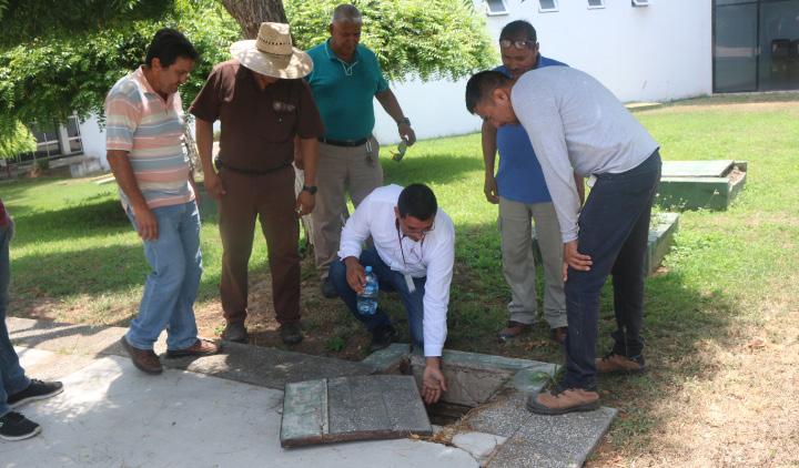 Personal de servicios generales, sobre todo de jardinería, recibió la información de saneamiento básico (Lava, Tapa, Voltea y Tira) por parte de Irene Carrasco y Ernesto Mejía, de la Secretaría de Salud en el estado, quienes también enseñaron la forma adecuada de buscar criaderos.