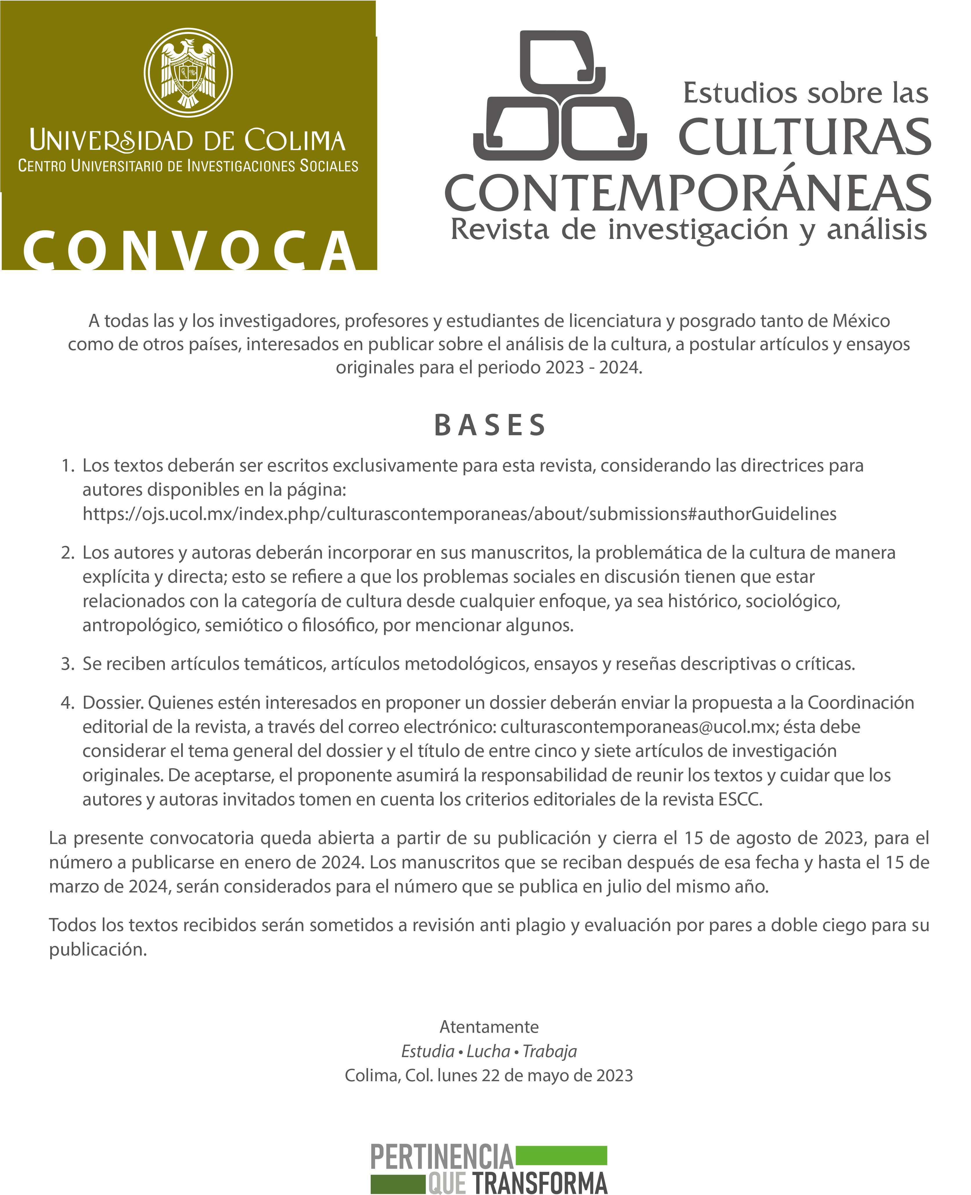 nacionales y que, con la convocatoria de Fortalecimiento a la Investigación, hay una posibilidad de fuente institucional. Este año, la convocatoria ya se encuentra abierta y vence el 16 de junio y tiene la posibilidad de financiar hasta 10 proyectos con 100 mil pesos para cada uno (https://www.ucol.mx/ convocatorias/c-941.htm).