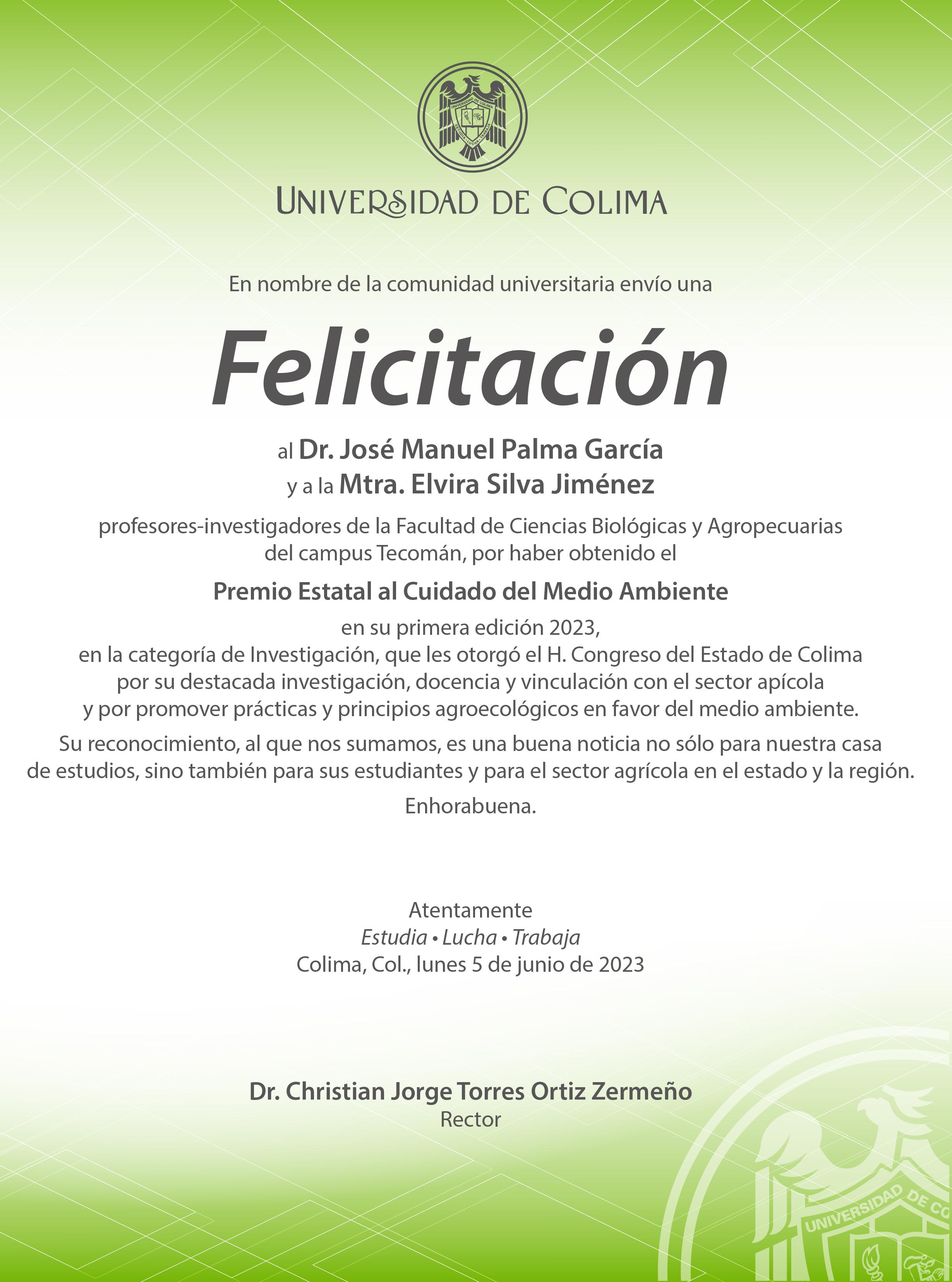 Los investigadores universitarios José Manuel Palma García y Elvira Silva Jiménez se hicieron acreedores al Premio Estatal del Cuidado del Medio Ambiente 2023, que por primera ocasión se entregó en Colima en el marco del Día Mundial del Medio Ambiente.