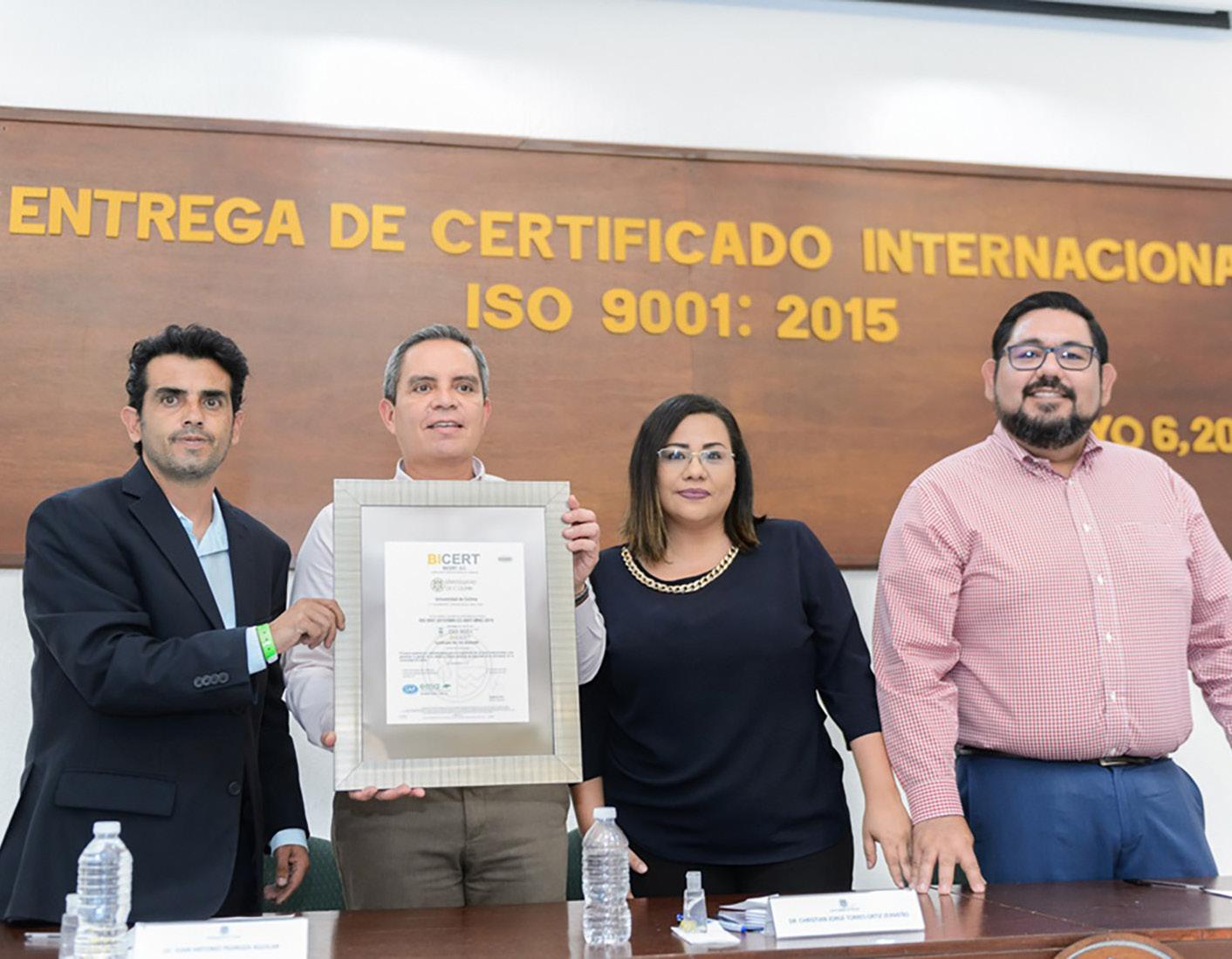En el auditorio de la Facultad de Enfermería, Christian Jorge Torres Ortiz Zermeño, Rector de la Universidad de Colima (UdeC), recibió, en nombre de esta Casa de Estudios, el Certificado Internacional ISO 9001:2015 de manos de Juan Antonio Pedroza Aguilar, gerente del organismo certificador BICERT.